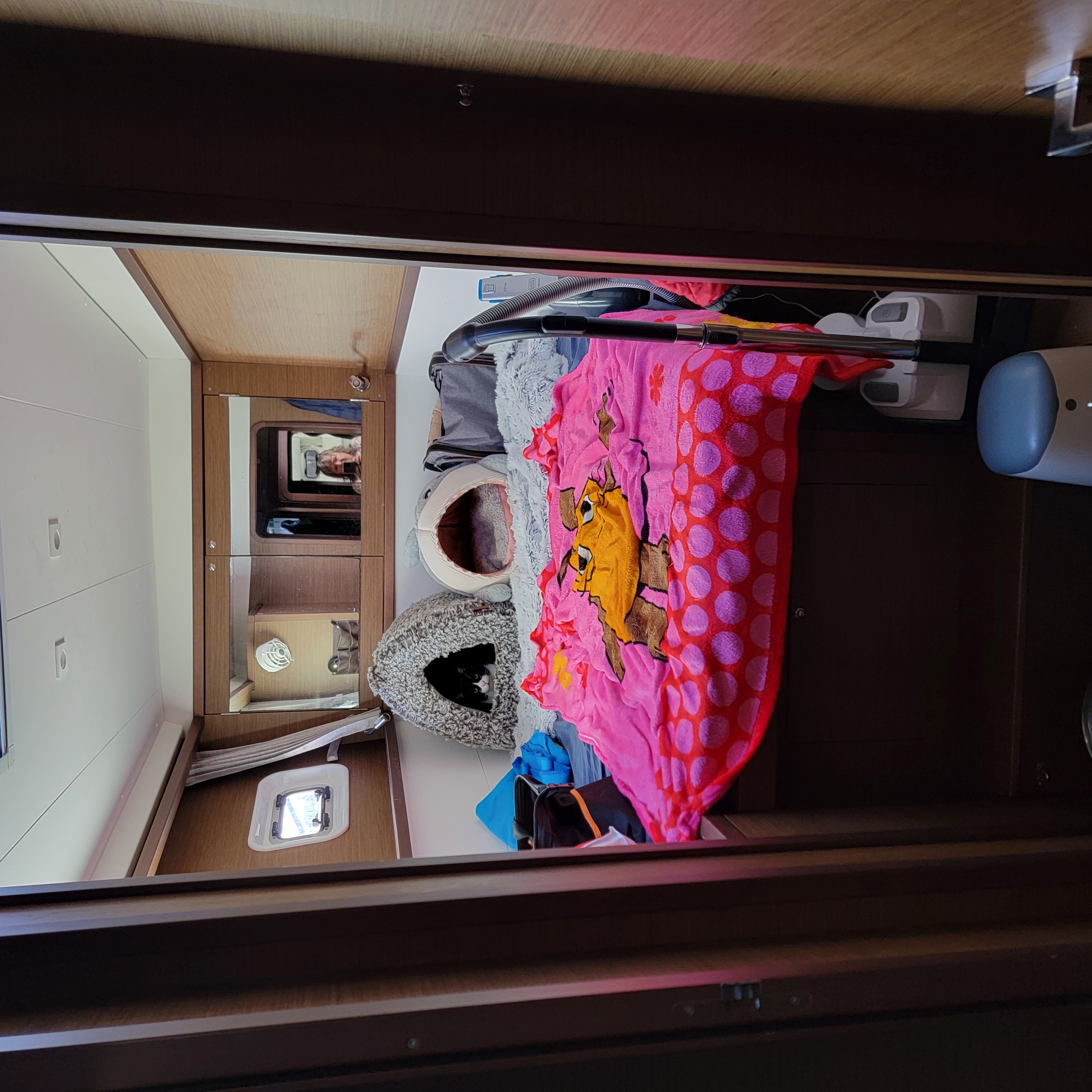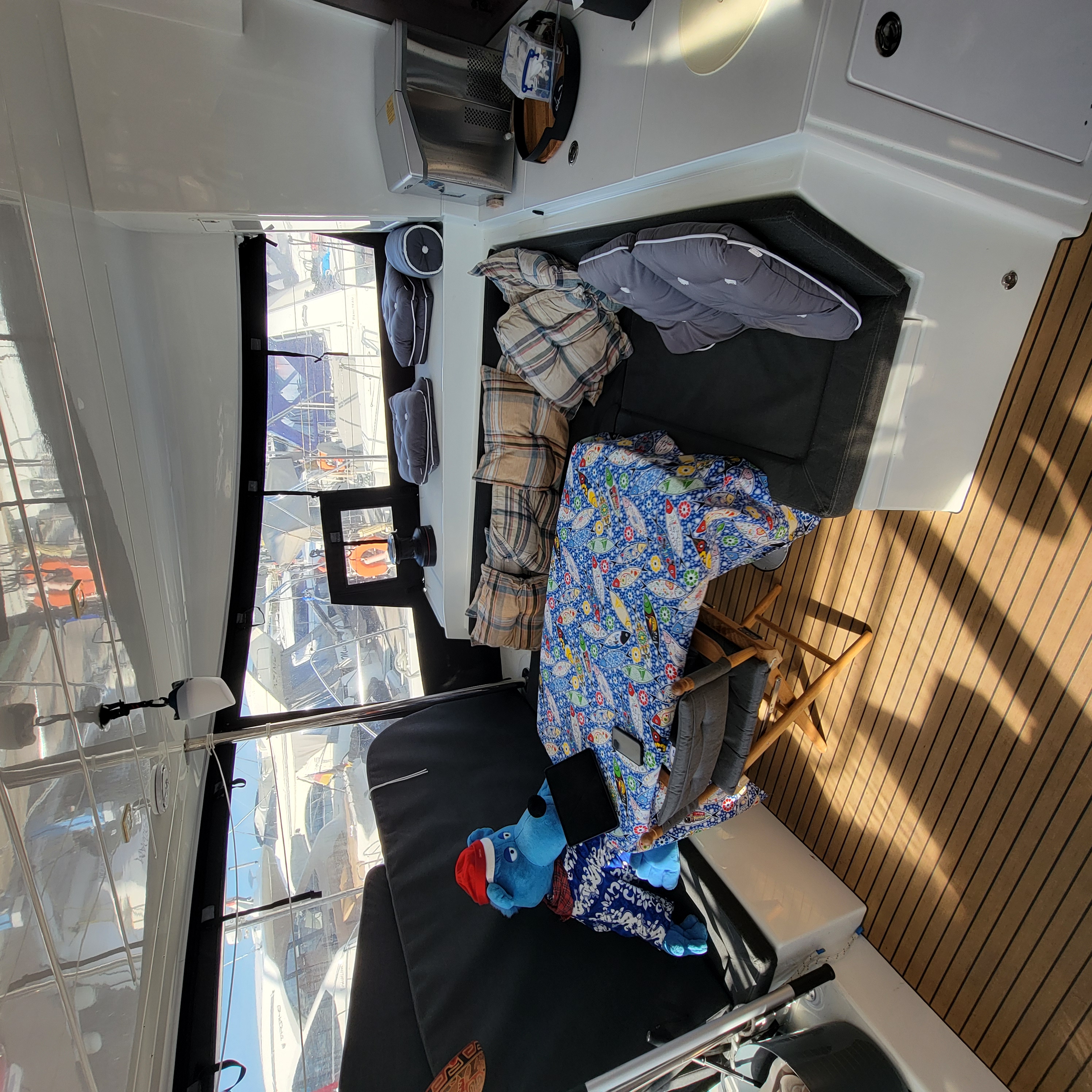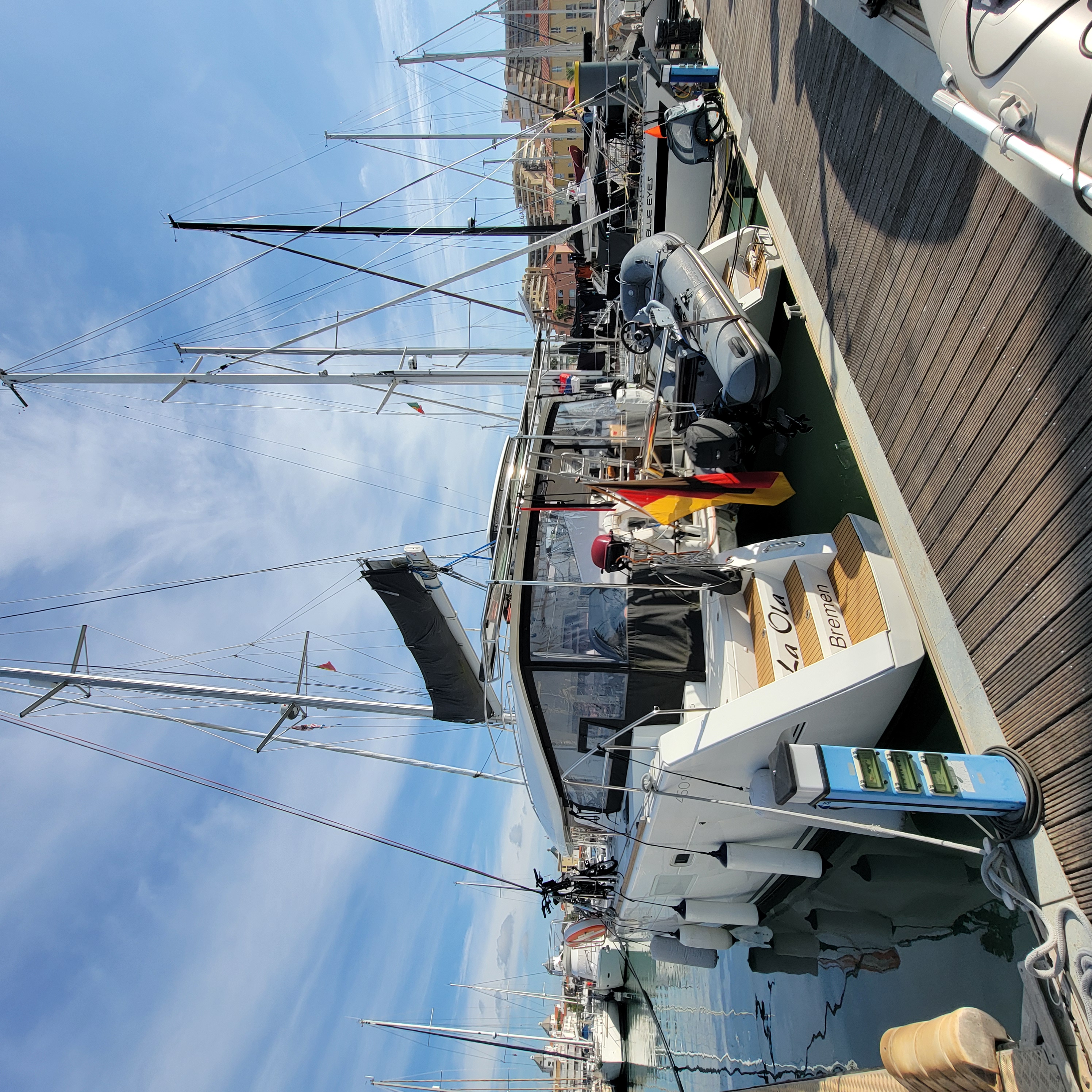 Sort by La Ola at the dock at Villamoura La Ola at the dock at Villamoura Captain Blue Bear still on duty Big cat with spacious living area And ginormous galley My cabin A cabin fit for a gatito, although he was very shy No need to sit inside when it is so warm, even in November Taking a day trip westbound Local kids out sailing Britt driving with autopilot on a very windless day. Very porous limestone coastline with lots of caves And nice beaches And lighthouses Another pretty coastal village Lovely old light house, ugly new light Portimao, across from where we anchored Entrance to harbor Our overnight anchorage Across the harbor Wash DCCanary Islands