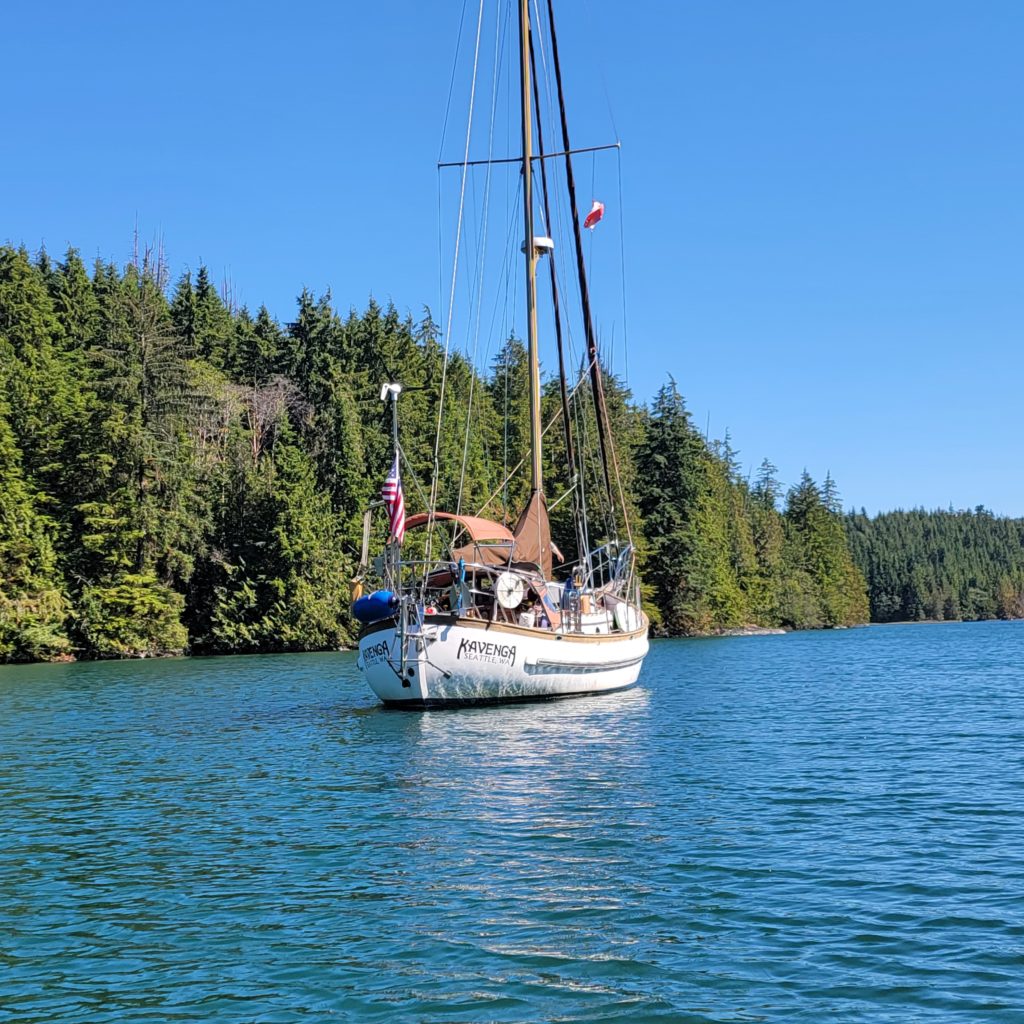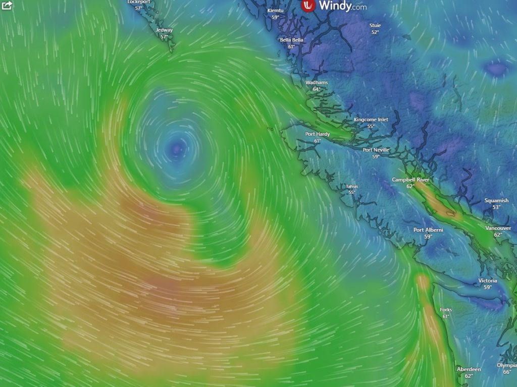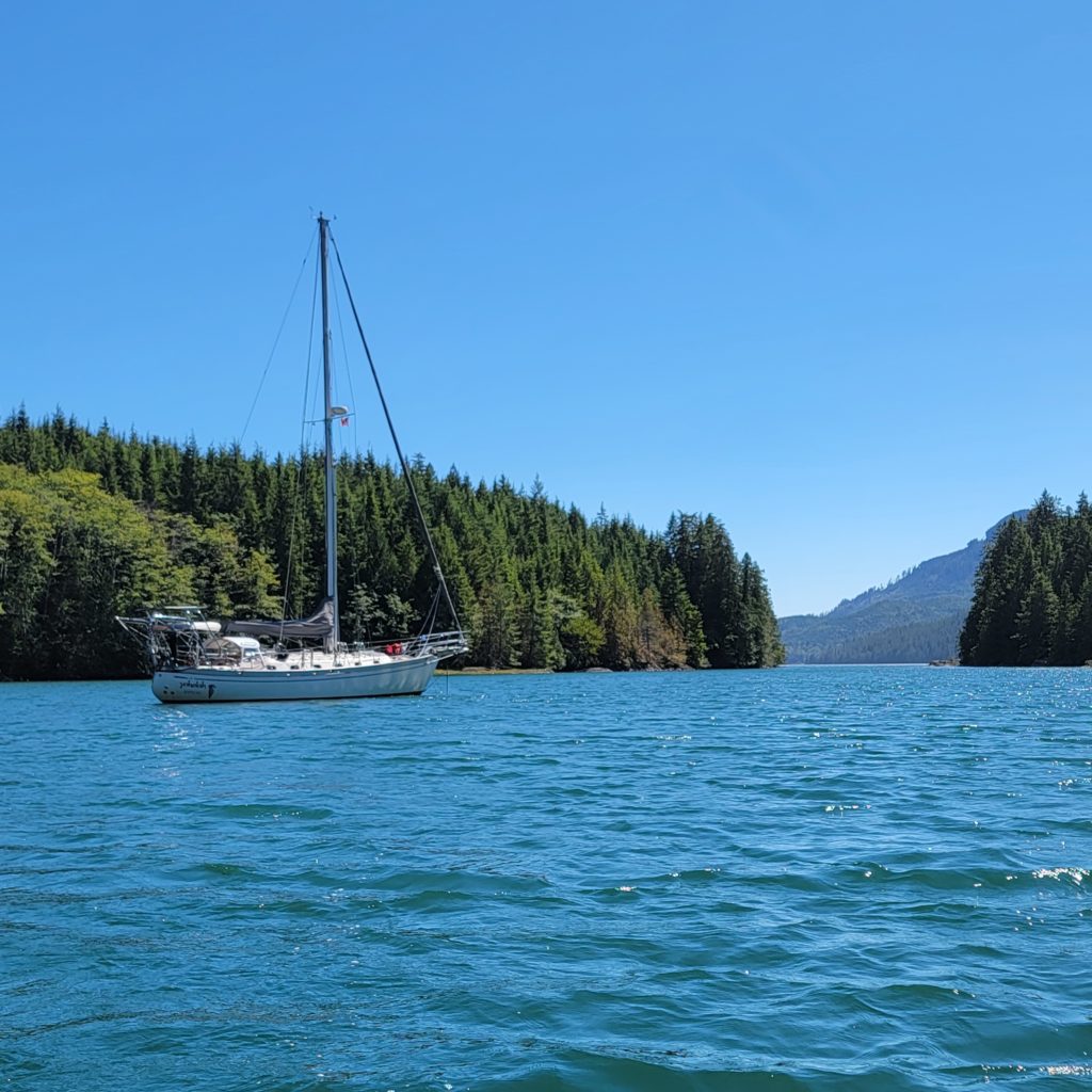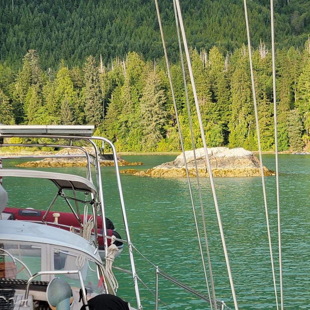 When we left Hesquiat on Sunday we planned to head into Tofino and anchor near a real town with real restaurants and grocery stores. We knew some southerly winds were in the forecast, but not strong enough to bother. As we motored along in the flat calm we heard an announcement on the VHF from the Coast Guard with gale warnings for the south coast. We had some random cell signal from somewhere and gave Windy a quick look and sure enough a little low was coming ashore up north and the southerly winds would blow strong until it passed by. So we diverted into a little cove called Quait Bay, and here we are now. It’s pouring down rain but we don’t feel a bit of wind. In a little bit we’ll set up the starlink and look at the buoy reports from offshore and see when we can leave here. Hopefully tomorrow afternoon it’ll be settled down and we’ll get to Tofino.