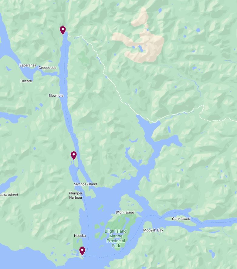 We stopped and fueled and watered on our way out of Tahsis, then headed out towards the mouth of Nootka Sound. We were deep in the mountains at the head of Tahsis Inlet, 20 miles from the ocean. We had a little time to explore Nootka, so we chose a nice little bay about half way out.