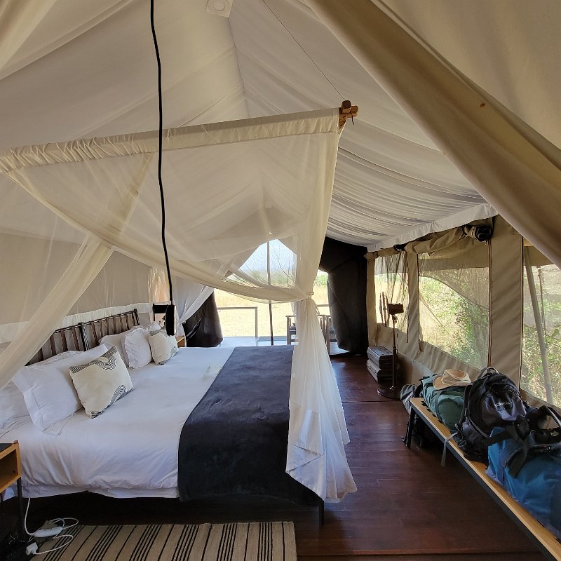 Sort by Lamai Airstrip in the Northern Serengeti A Secretary Bird Serengeti is derived from Maasai word meaning Endless Plains Our last camp is a mobile one Heading to our tent This camp moves every six months between north and south Serengeti Inside is still lovely though Toilet inside but shower is bucket filled by attendant outside while you shower Comfy bed and bug netting as always Lots of room for our bags and fresh air during the day Front porch view across the Serengeti Endless Plains Our first sighting is four giraffes right near camp Giraffe cutie Giraffe Giraffe They're usually shy but these got pretty close This one had been recently rescued from some snares tangled on her leg Ngoronngoro CraterTanzania Video Clips