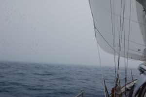 Not that we wouldn’t like to slow down and enjoy this last passage for now, but sailing in light air in a very dense fog doesn’t really lend itself to moments of bliss. We’re well into the North Pacific high right now and really expected to find sunshine. Nope. Still dense fog – I could see about 3 boatlengths away all day long today. The barometer shows 1025MB of pressure, with the center of the high reported as 1033MB, so we’re pretty close.