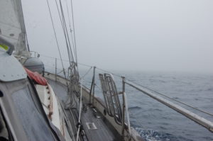 Now it’s nearly midnight, and indeed the wind did die. We have 2.5 knots of true wind, so we’re motoring in the fog once again. We’re off Barkley Sound, which is a favorite vacation spot of years past, but tonight we’ll just motor on by. We should be on the dock in Port Angeles early tomorrow evening.