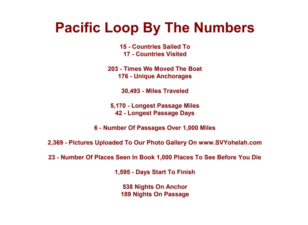 As has been mentioned many times in this blog, one of the things we enjoy most about cruising is the opportunity to learn something new every day. What was the most important thing we learned in the last 1,595 days? I think it was that we do love cruising and want to do more, but we also need to take a break once in a while. We have traveled hard since leaving Ecuador in November ’08, racking up over 20,000 of those miles in the last 20 months. So for now we’ll stay home for a bit and keep up the website with information about the boat. Then when the time is right we’ll start another blog and head south again for our next adventure on Yohelah. Until then, thanks everyone for sailing along with us. It has been so much fun.