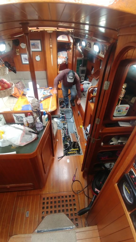 So let’s see how we did on that “get ready for sailing” list. A checkmark means we accomplished what we wanted, a star is partially done, and the big X means nothing happened. But, given that we had an implosion of caustic cleaner into our bilge and everything was interrupted by pulling and repainting two fuel tanks, I’ll take one check and three stars. The check was our biggest priority, so she’d not look awful when we moved to her new home at PYC, and that was accomplished through some very long days of scraping varnish and scrubbing everything (and Brittney going aloft, THANKS!).