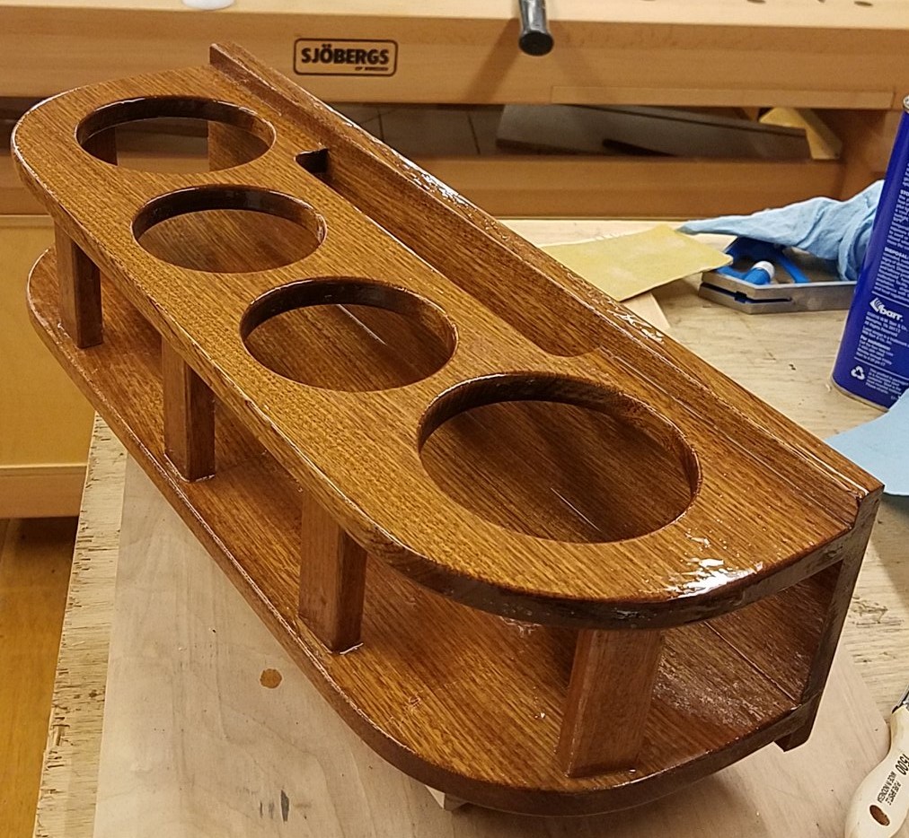 Here’s the cup holder in Rob’s shop, ready for install on the boat. It’s been designed and built to withstand anyone crashing into it, or grabbing it for stability when a wave rolls the boat. It’s also designed to hold stemless wine glasses or a wine bottle in each hole. And the little slot in the back is the perfect place to drop your cell phone while you’re at the helm or sitting in the cockpit.