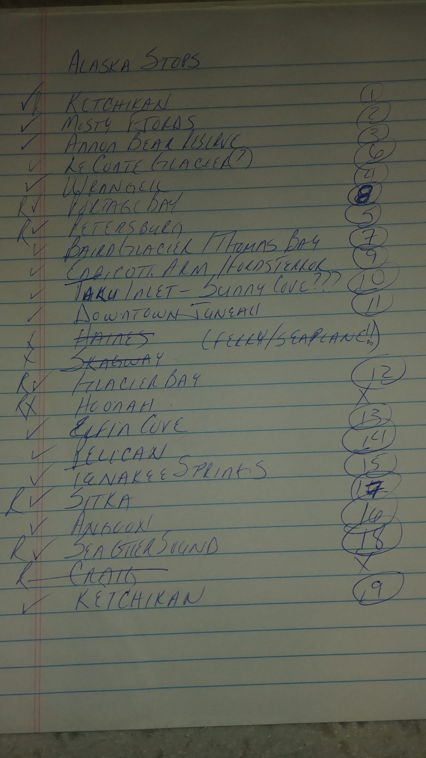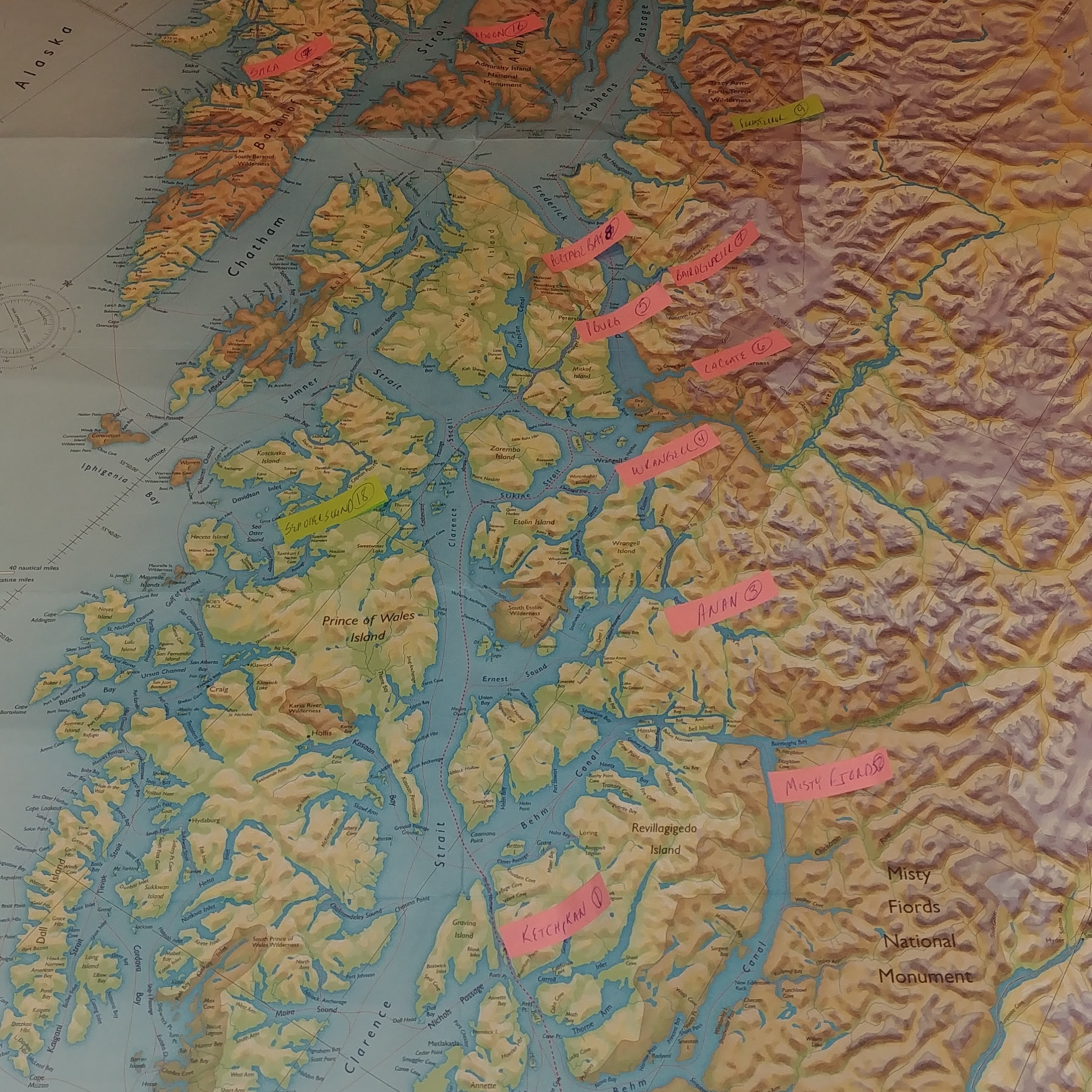 So we went through our list, put them in order, scratched some off, put some in questionable state, and came up with a more reasonable list. We’ll ask Elsie and Steve about the questionable ones (where do we anchor overnight when we go to Anan Bear Reserve, and is Ford’s Terror even do-able without being terrifying?). And we came up with some alternative ideas – I really would love to ride the train from Skagway over Chilkoot pass (although also likely terrifying), but don’t want to bash up Lynn Canal to get there, so we can fly up from Juneau.
