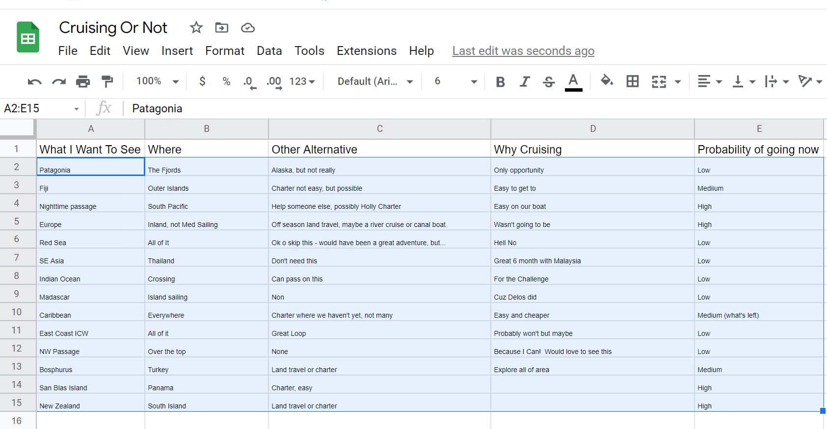 On my spreadsheet is a list of the places I want to sail. Every one, except Patagonia, can be done on a charter boat. I can’t cross the South Pacific under sail and see those incredible starry nights again on a charter, but maybe I can find a delivery skipper who needs an extra hand. The list of what I’ll miss if we don’t go again isn’t huge. And to Rob’s point, we did a really good job of seeing the Pacific last time we were out.