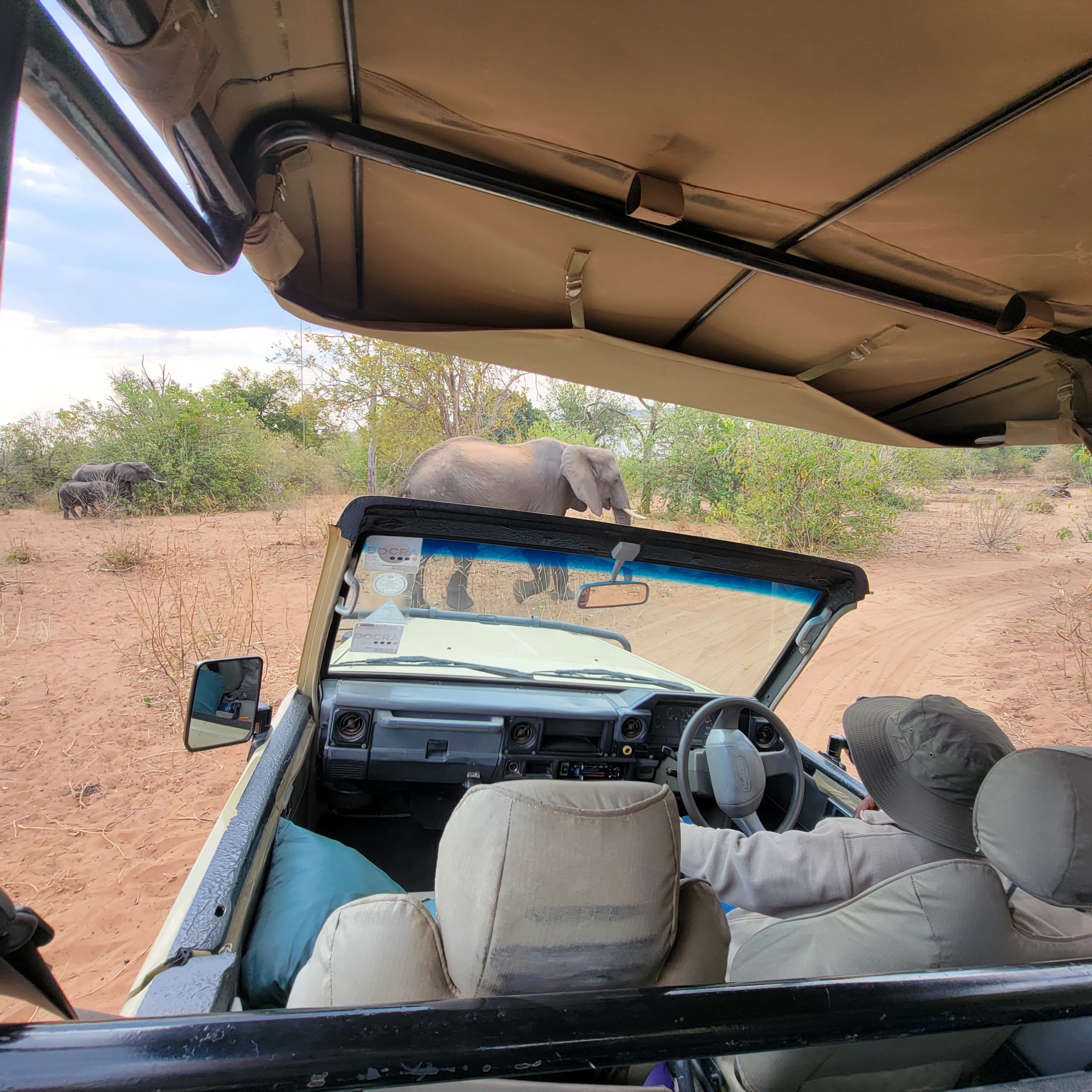 What he didn’t tell us was that when Joe (the guide) says “This is a breeding herd of elephants”, that you need to be very alert to what’s happening. When mama and baby get in front of the truck, and put you between her and the big bull elephant, things are not going to go well. Especially since mama and baby are in the road you need to drive down to escape the now charging bull. And then mama starts screaming, which is not helping anything. I have no video of this, but the memory remains vivid. Joe told us it was what they call a “Mock Charge”. A real charge means his ears are back, and his trunk and tail are high in the air. I did not see what he looked like because once I realized what was happening I just looked straight ahead toward the escape route. Literally, the bull was only feet away from the truck.