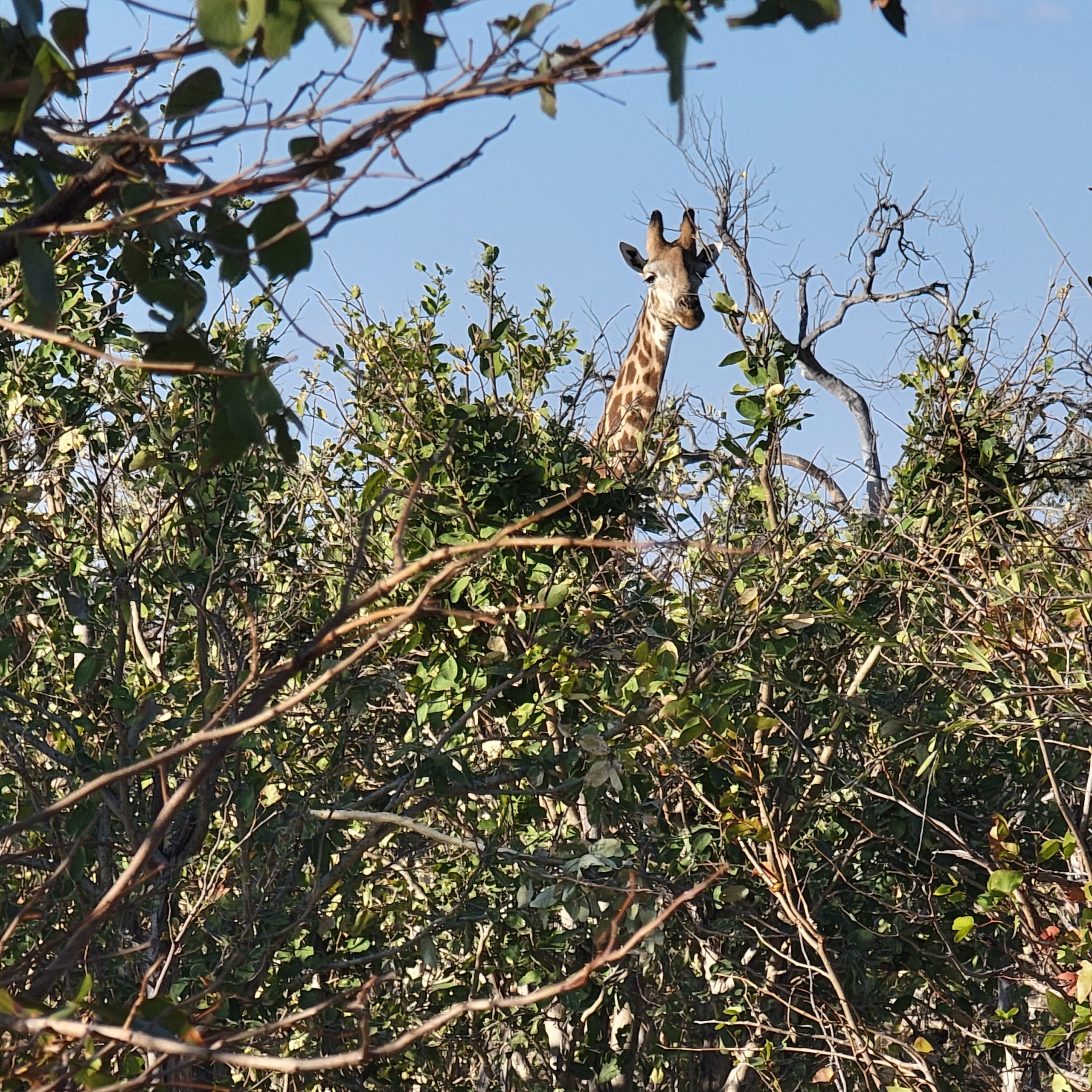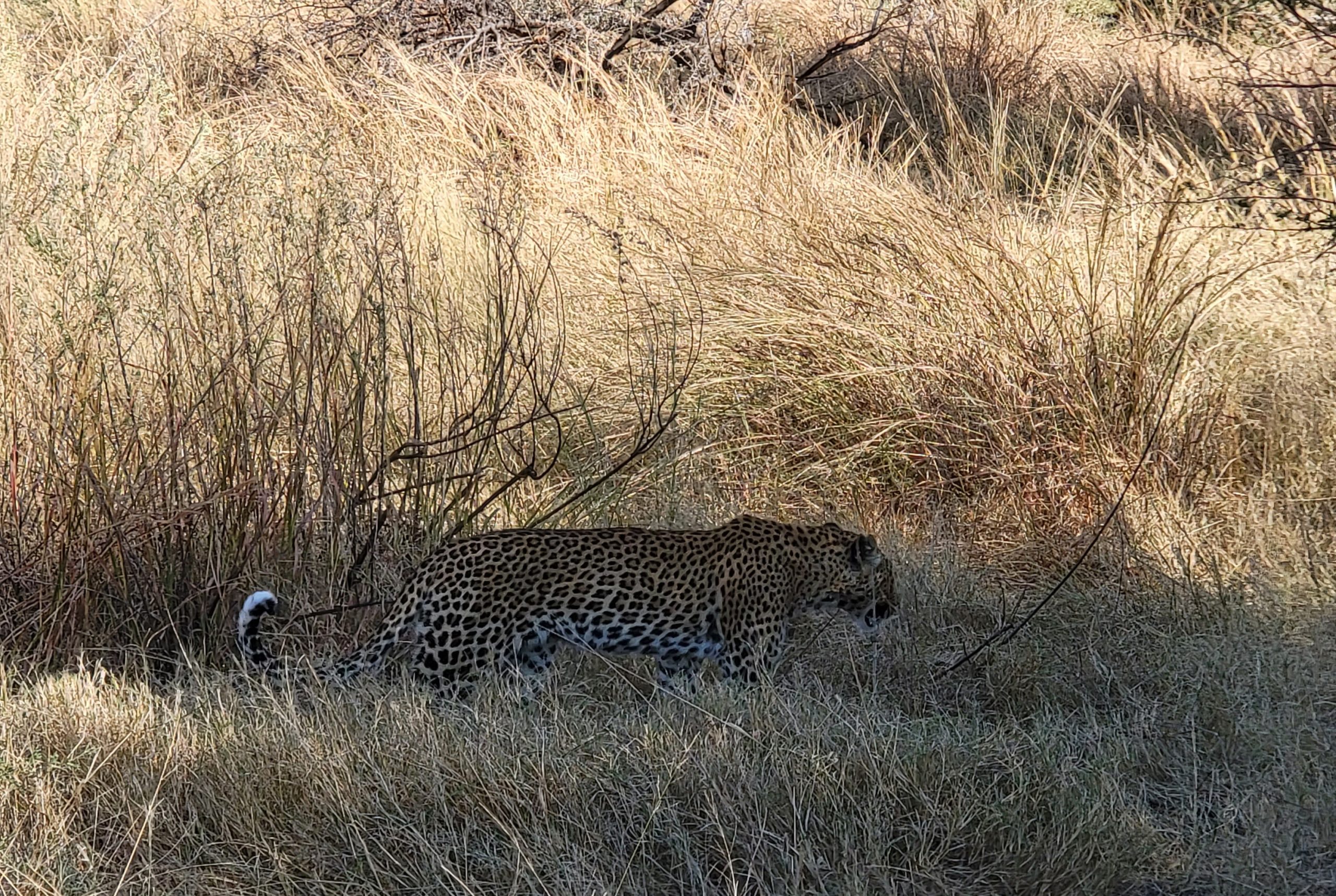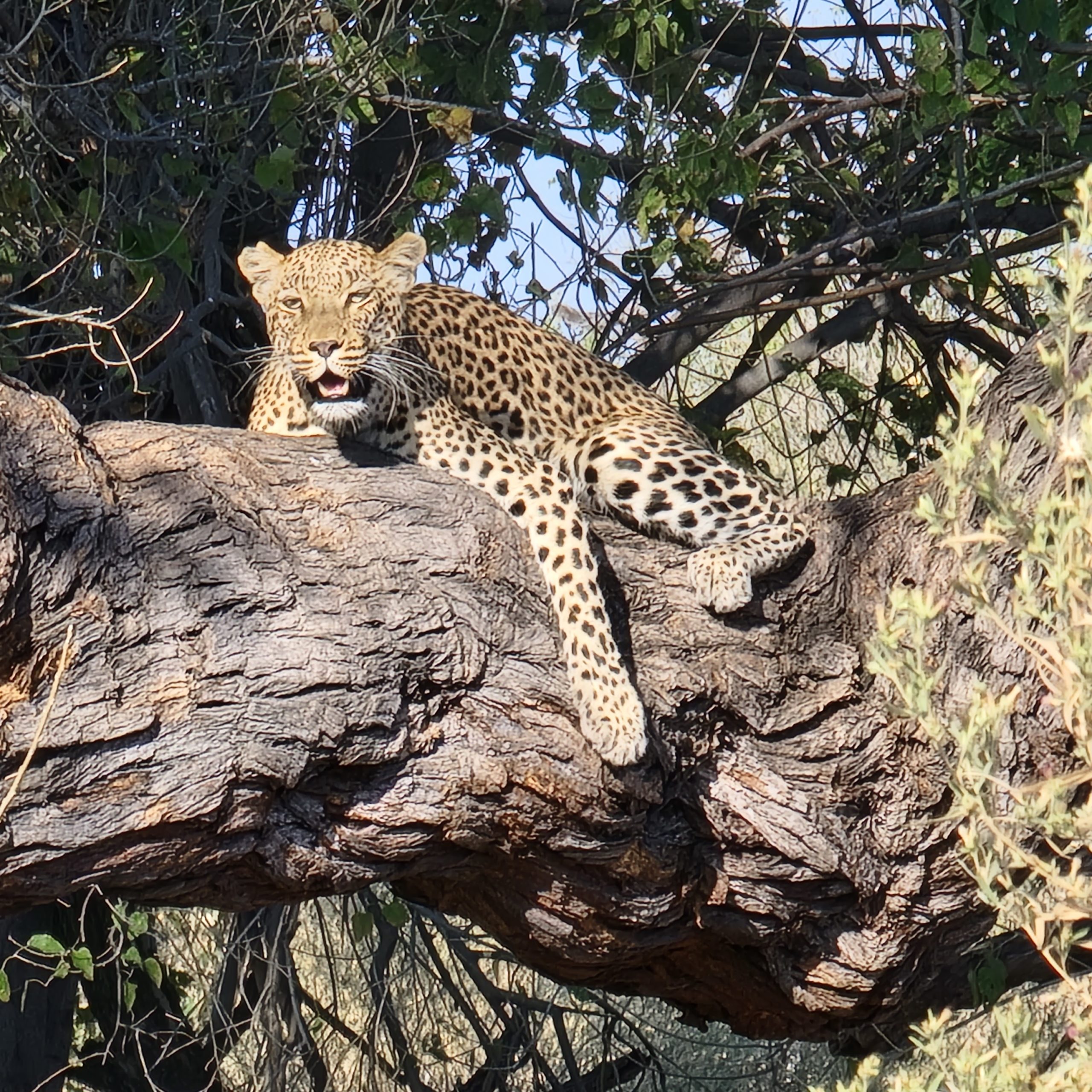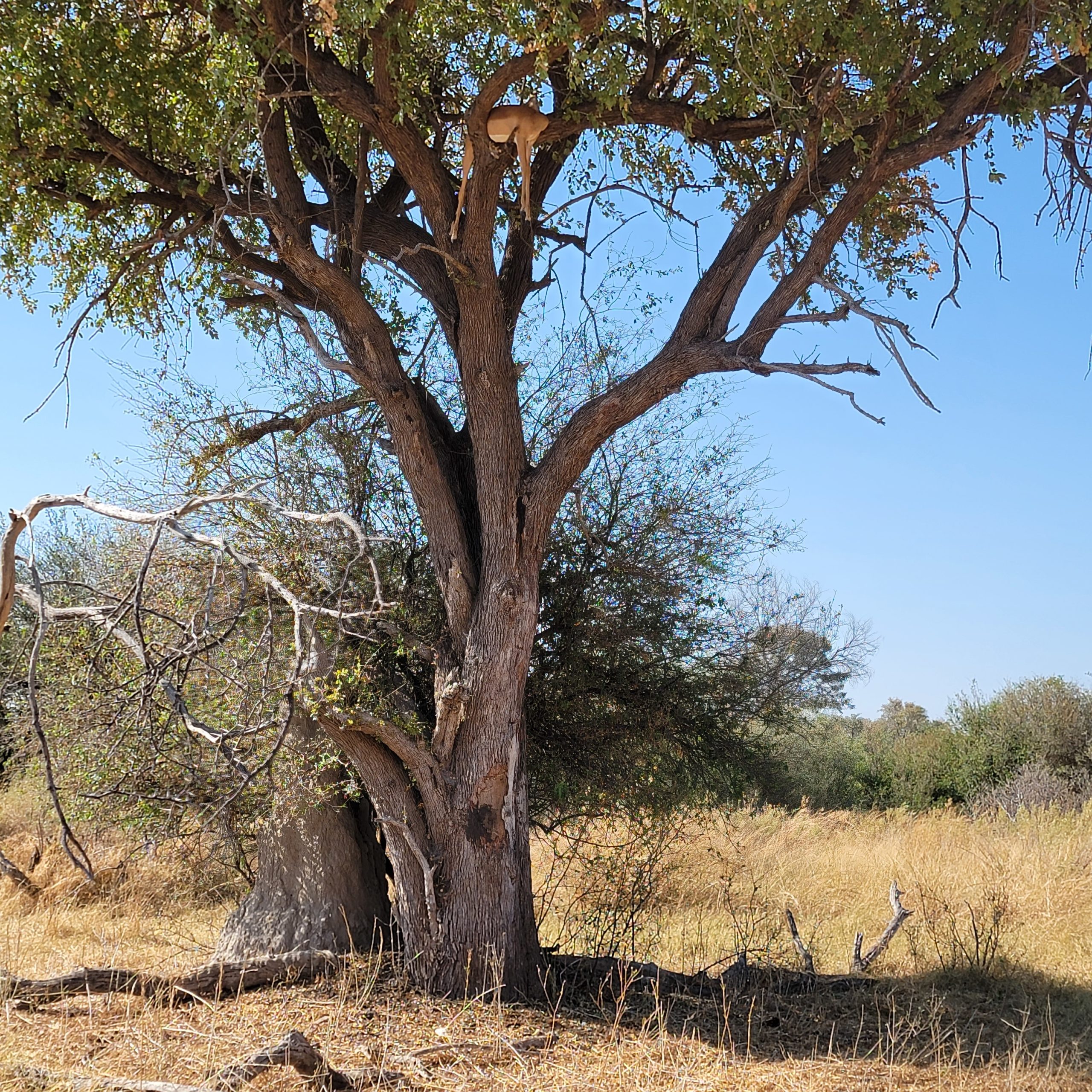 You can see the impala high in this tree. The leopard has left it for now, but Alco says she’ll spend about 3 days eating this meal. Think about the balance it must take to be high up there and still feed on the impala. But the leopard knows with it there in the branches that the vultures can’t get to it from the air, and leopards are one of the few animals that climb (surprisingly, the lions do not). So the only threat to a leopard’s kill is another leopard or baboons. Leopards are solitary hunters, so one will steal from another, but likely it’s easier to find another impala rather than fight for that one (just my opinion). I don’t know about the relationship between leopards and baboons, but will find out in Namibia.