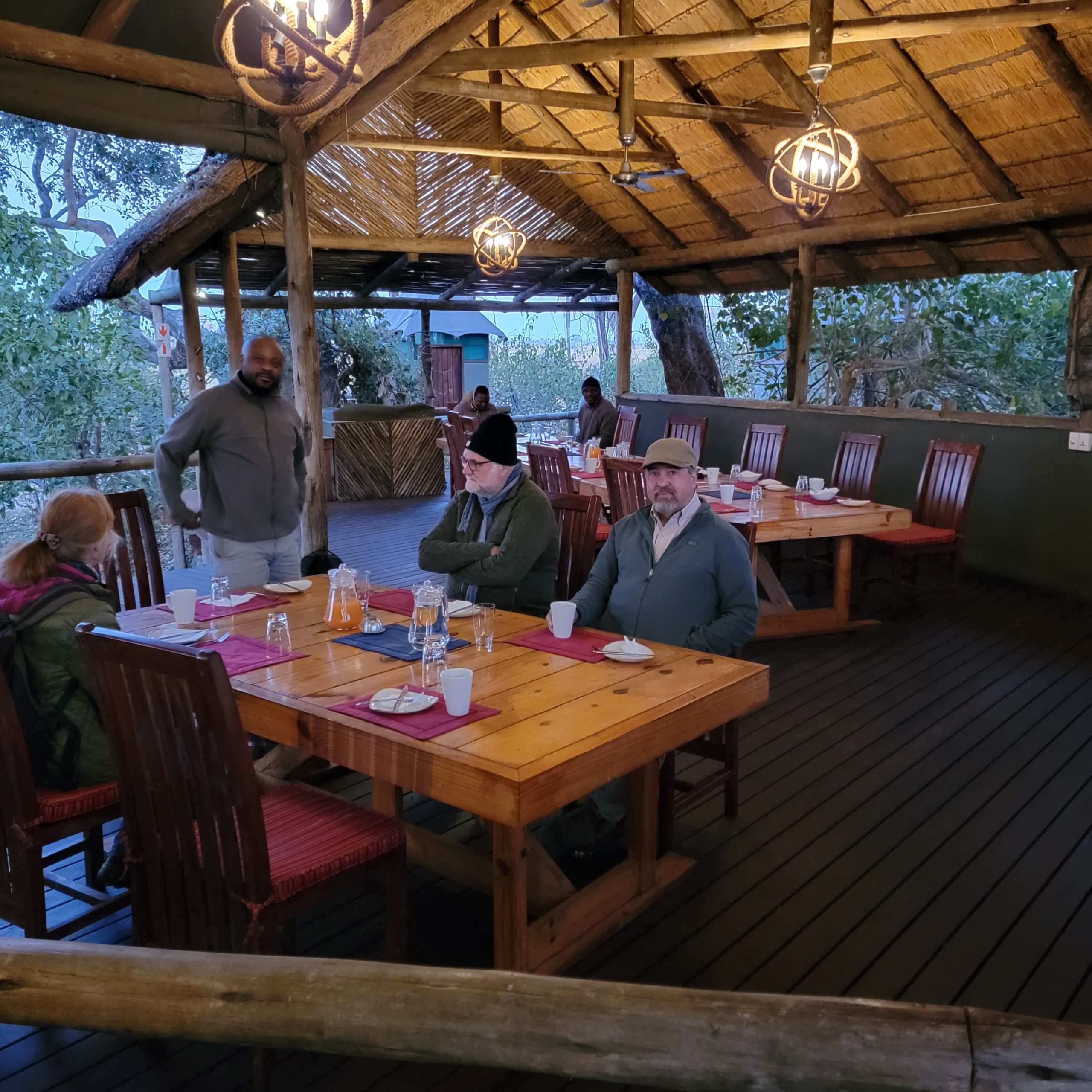 At 7:00 we would leave for a morning game drive. The vehicles are open, so they provide us with blankets to keep warm until the sun warms the area. The pic above shows our guide Alco doing what he calls “Reading the Morning News”, which means checking animal tracks. The morning drive is about 3 hours long, and includes a stop for biscuits and coffee. We get back to camp before 11:00 when brunch is served, which is a big meal including hot dishes, cheeses and fruits, and eggs cooked to order. Then we go to our tent for siesta until 3:30, when we return for high tea and a small snack.
