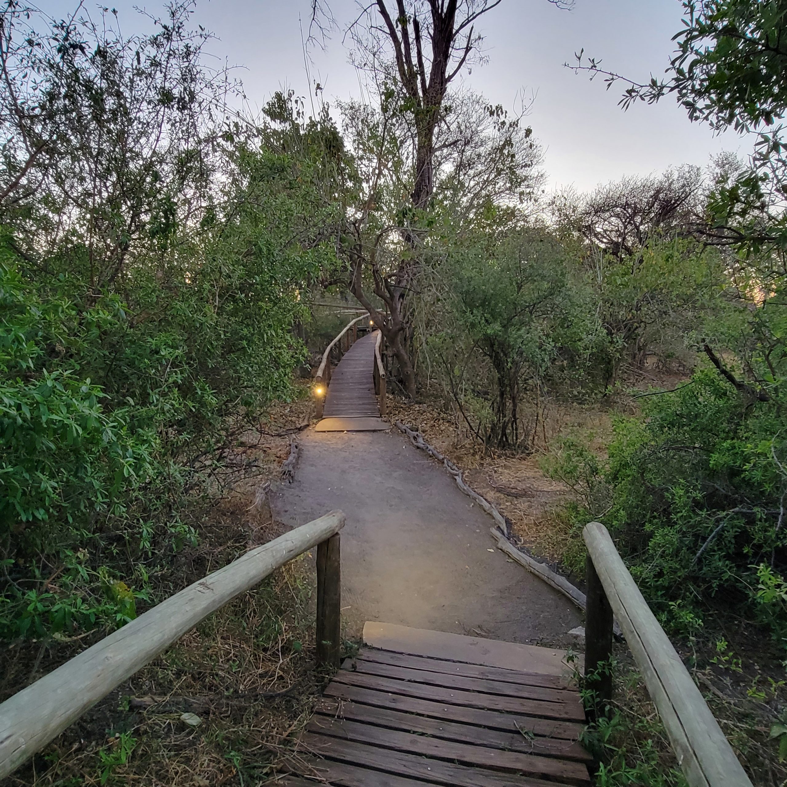 The guide would return at 6:15 to walk us to breakfast, because it was still dark and we were not allowed out of our tent alone. The pic above shows the boardwalk to camp, and the elephant/buffalo/whatever crossing. Breakfast is a small meal with yoghurt and cereal and muffins.