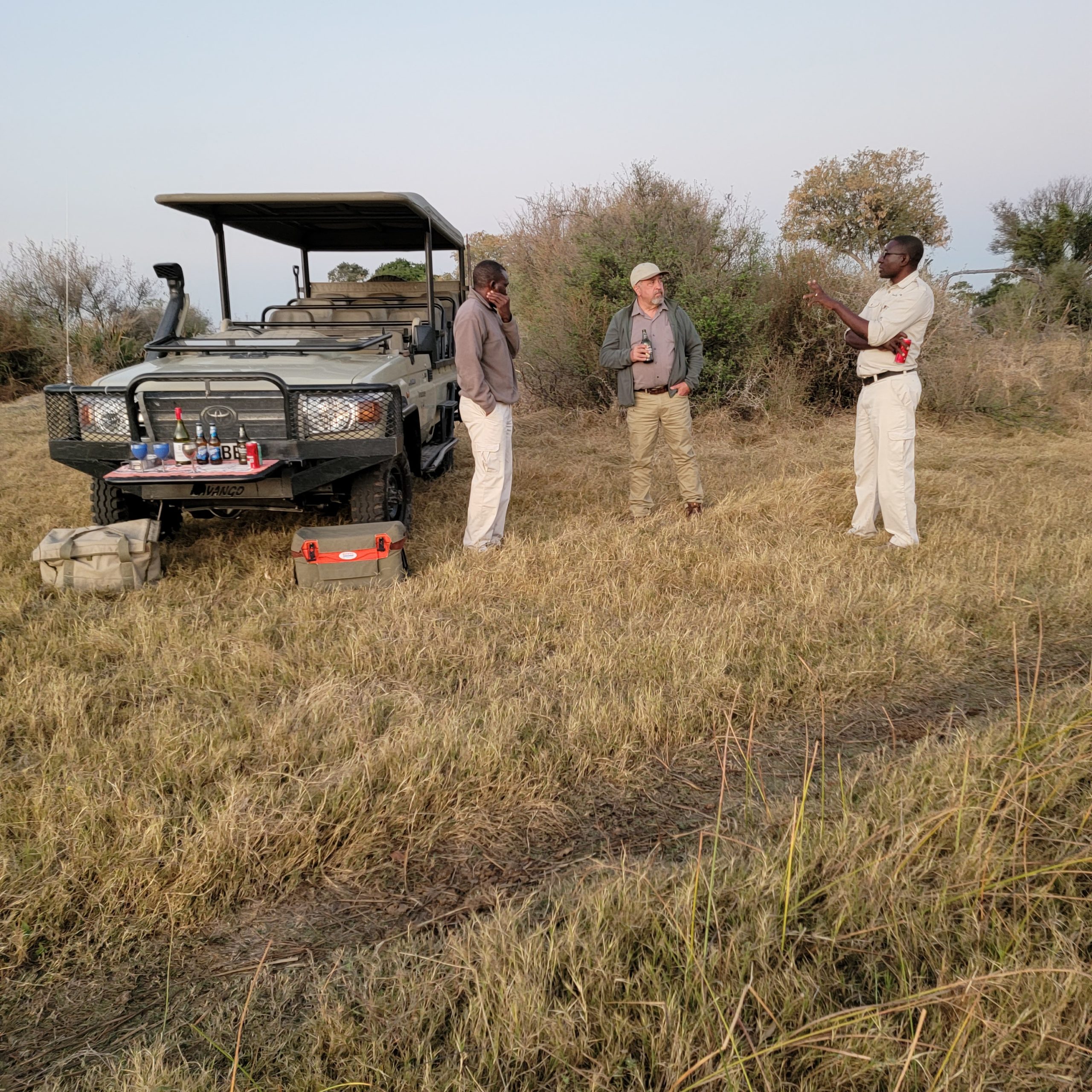 At 4:00 we’re off for the evening game drive. At sunset we stop and enjoy a sundowner and the beautiful setting sun. Then we’re back to the camp around 7:00 for a drink around the fire before dinner at either 7:30 or 8:00. After dinner the guide walks us back to our tent for the rest of the evening.