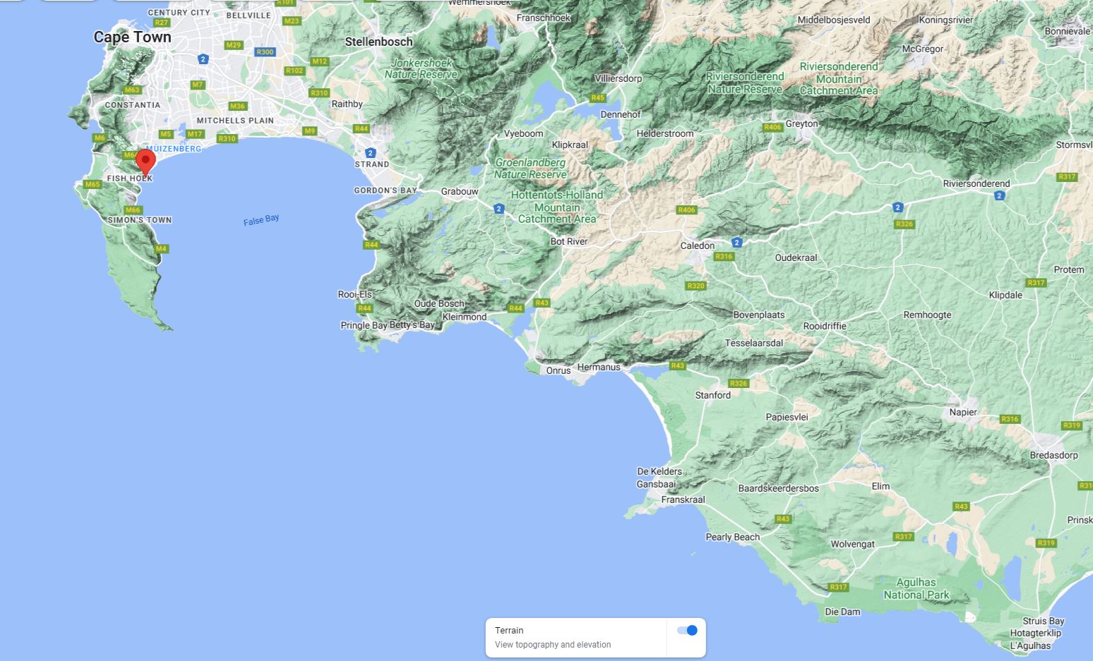 We rented a VRBO in the little beach town of Kalk Bay, which is south of Cape Town on False Bay. To the east lies Pringle Bay, with the Cape of Good Hope to the west. 60 miles as the crow flies southeast of Pringle Bay is Cape Agulhas, the furthest south point on the African continent. That is a milestone that we thought for sure we would sail around in our boat one day. But now we’re visiting this area by car and driving instead of sailing.