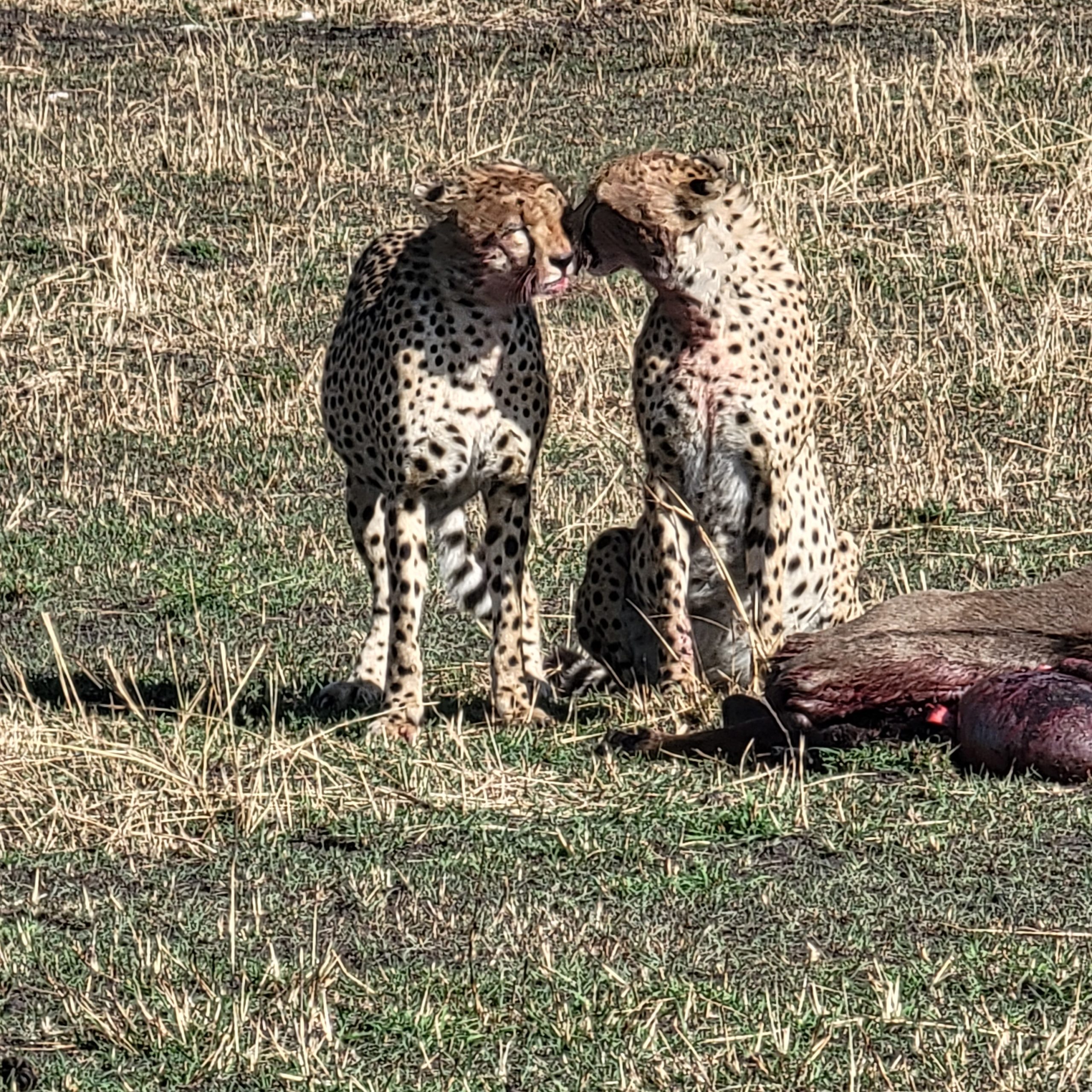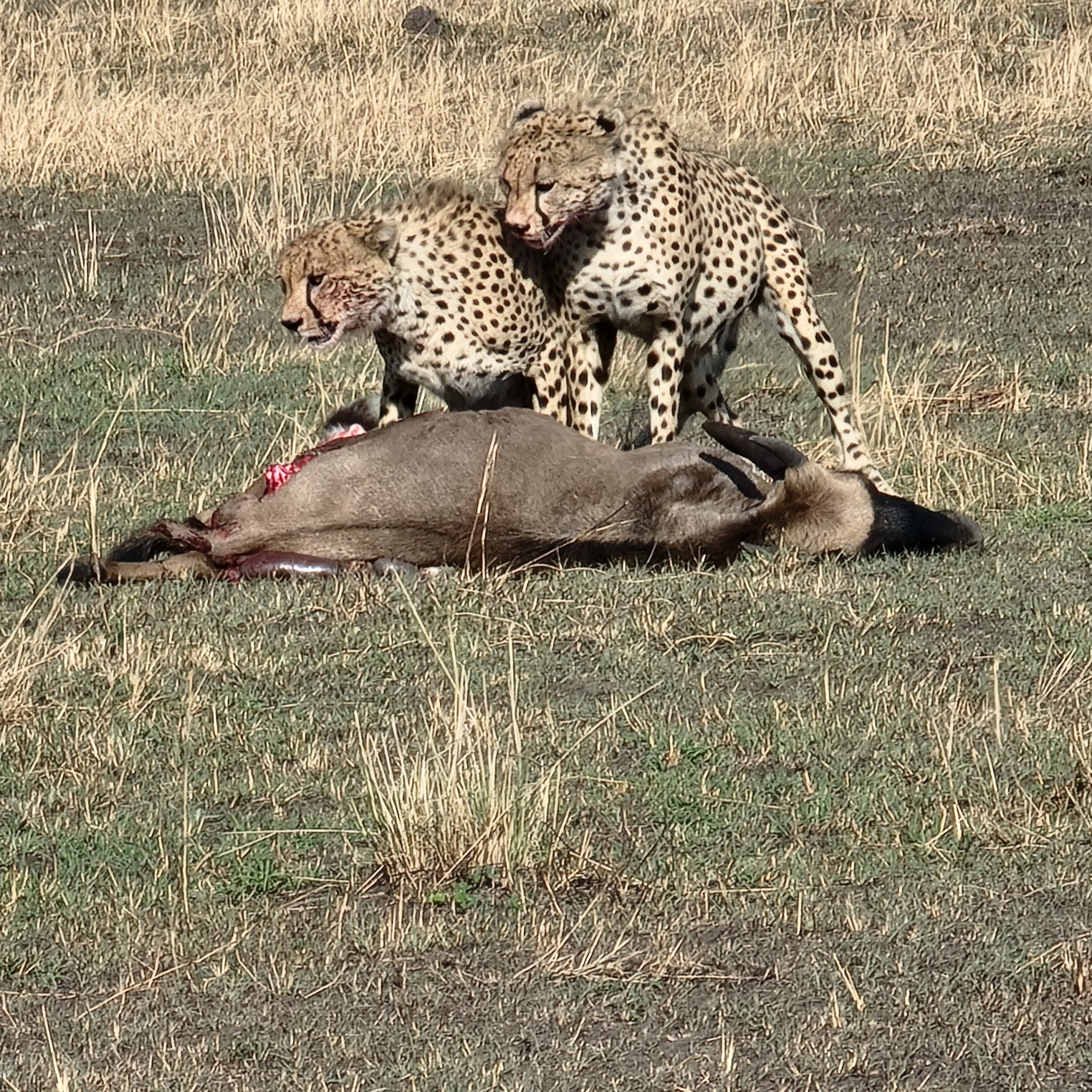 Cheetah brothers eating a wildebeest kill