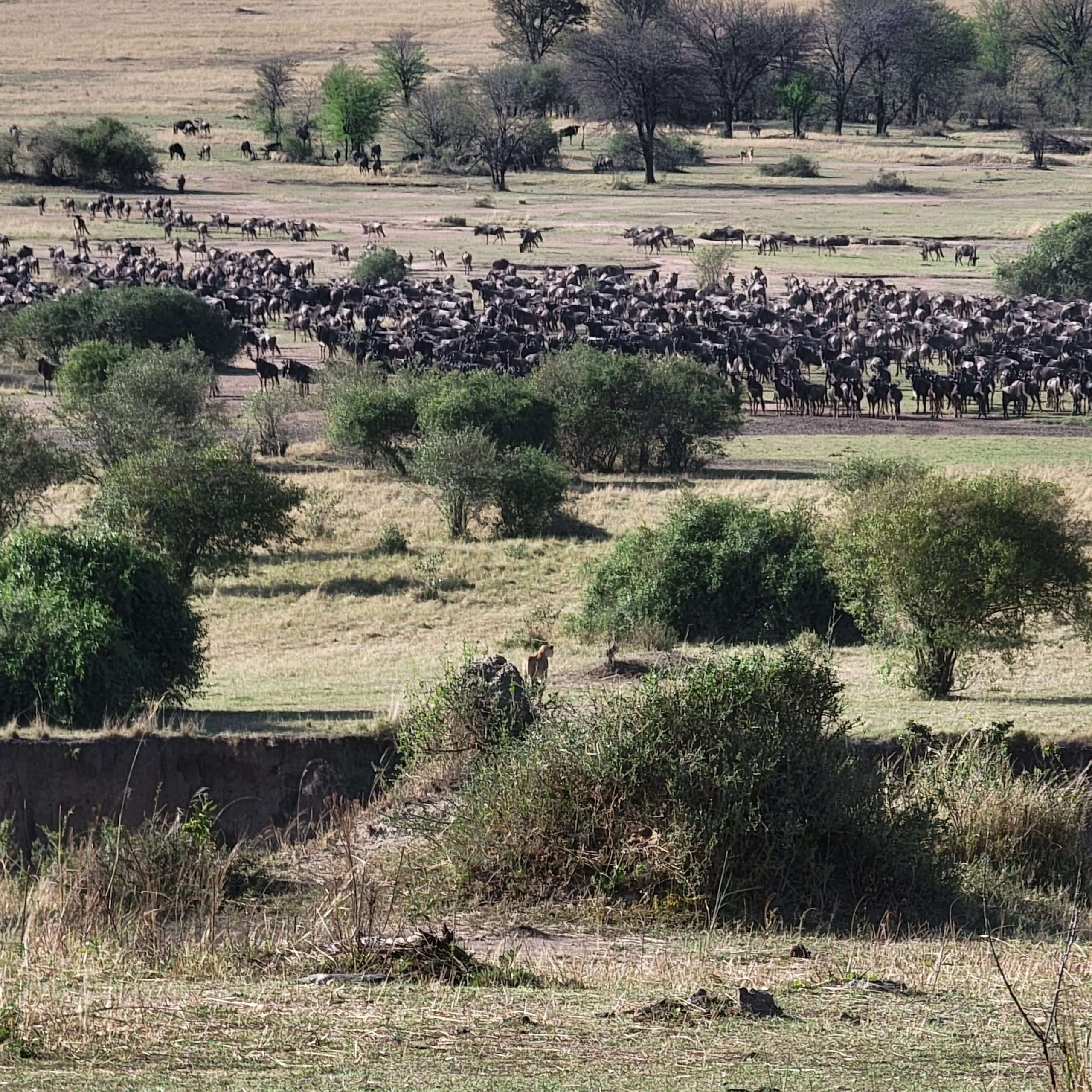 But of course that’s not all there is to see in the Serengeti. We also enjoyed sightings of elephants, giraffe, zebras, leopards, lions, and a zilliion wildebeest. This is migration time, so there are wildebeest herds everywhere. We went to the river to watch for a crossing, and Emmanuel spotted a lion under a tree watching the herd. We could not tell it was a lion, even with the best binocs and long lens on the camera. Suddenly the entire herd was running as fast as they could, and a lion was in the chase from behind. We looked over and the lion under the tree was out and joining the chase also. They didn’t catch anything that time, and Emmanuel says that lions are basically lazy and if it’s not easy they won’t work for it. Must be nice to be king of the jungle.