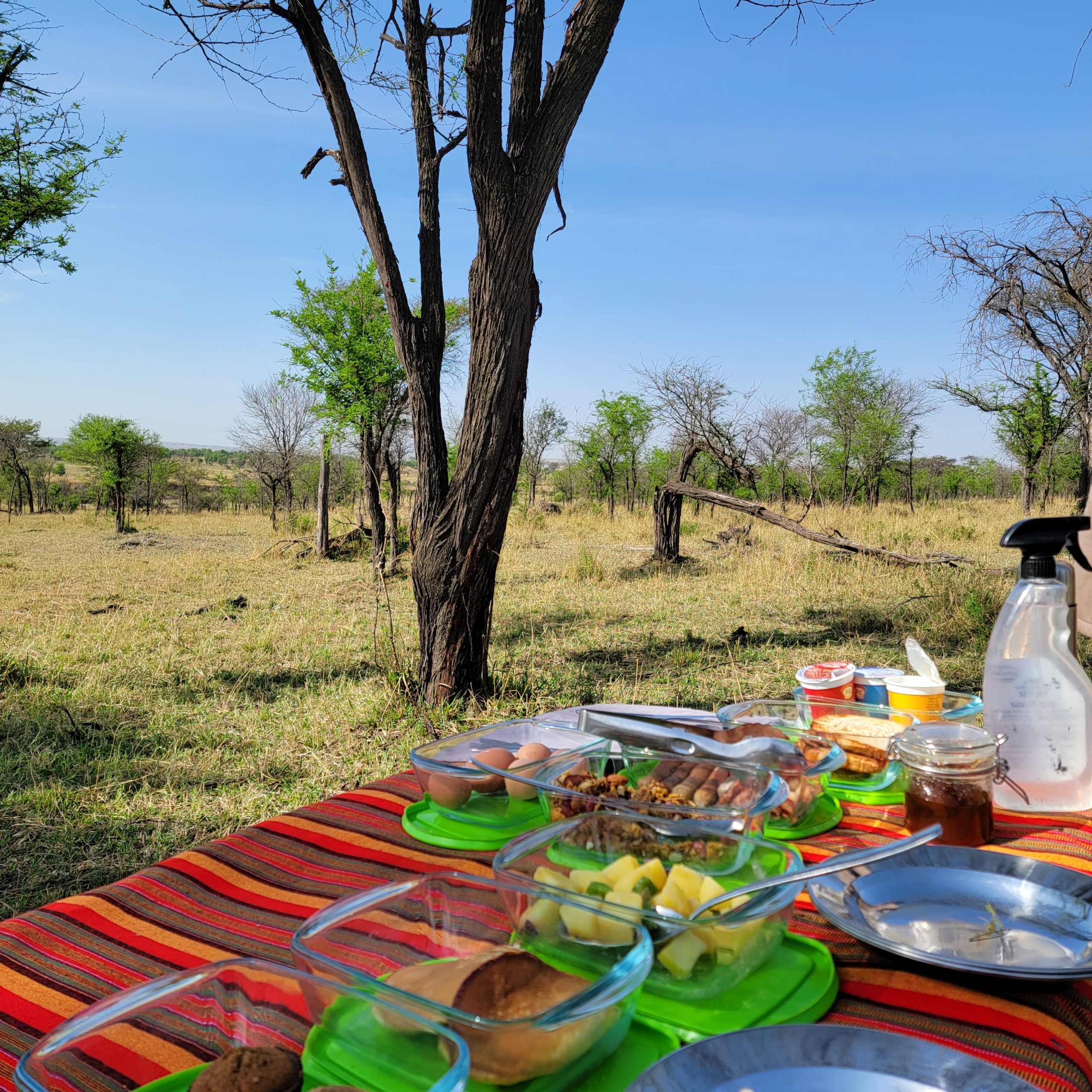 One of the events the guides offer is for a “bush breakfast” or “bush lunch”. We had eaten meals during game drives previously and thought this was no different. Knowing that our last breakfast in Africa was out on the plains of the Serengeti sounded perfect, so we asked for that. We left camp early before sunrise with breakfast packed away in the cooler. After watching the lion chase at the river, we drove up into the woods. I was surprised to not be out in the open where we could easily spot predators, but trusted Emmanuel. He unpacked a full spread of breakfast onto a table and we all enjoyed the meal. There’s more to this breakfast story that I won’t share online, but will become a great happy hour topic.