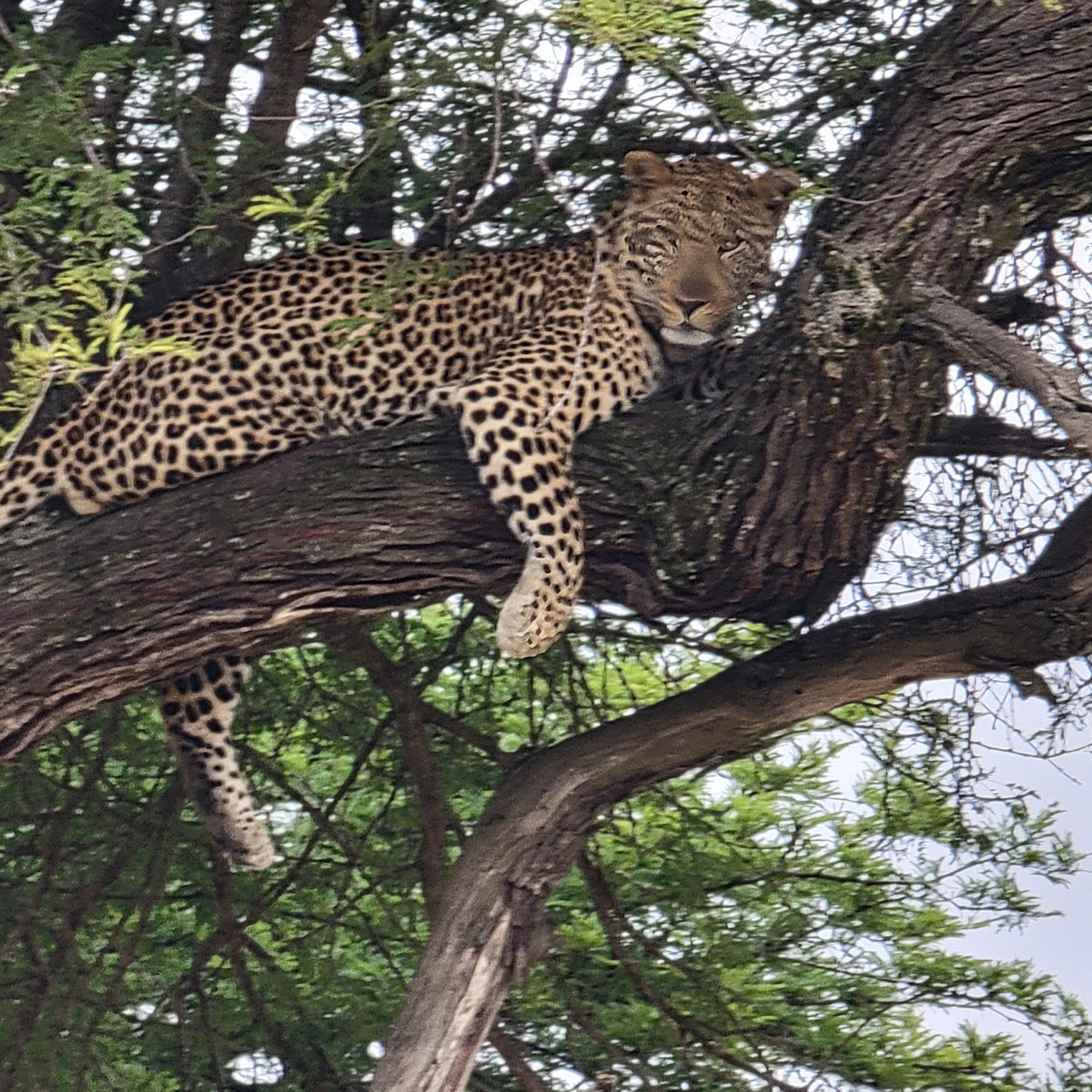 The next day we got lucky and had two more leopard sightings. Both were up a tree resting. One was very shy and climbed up high so we couldn’t see her very well, but the other was lazing around on a lower limb where we got to enjoy watching him for quite a while. They really are spectacular cats.