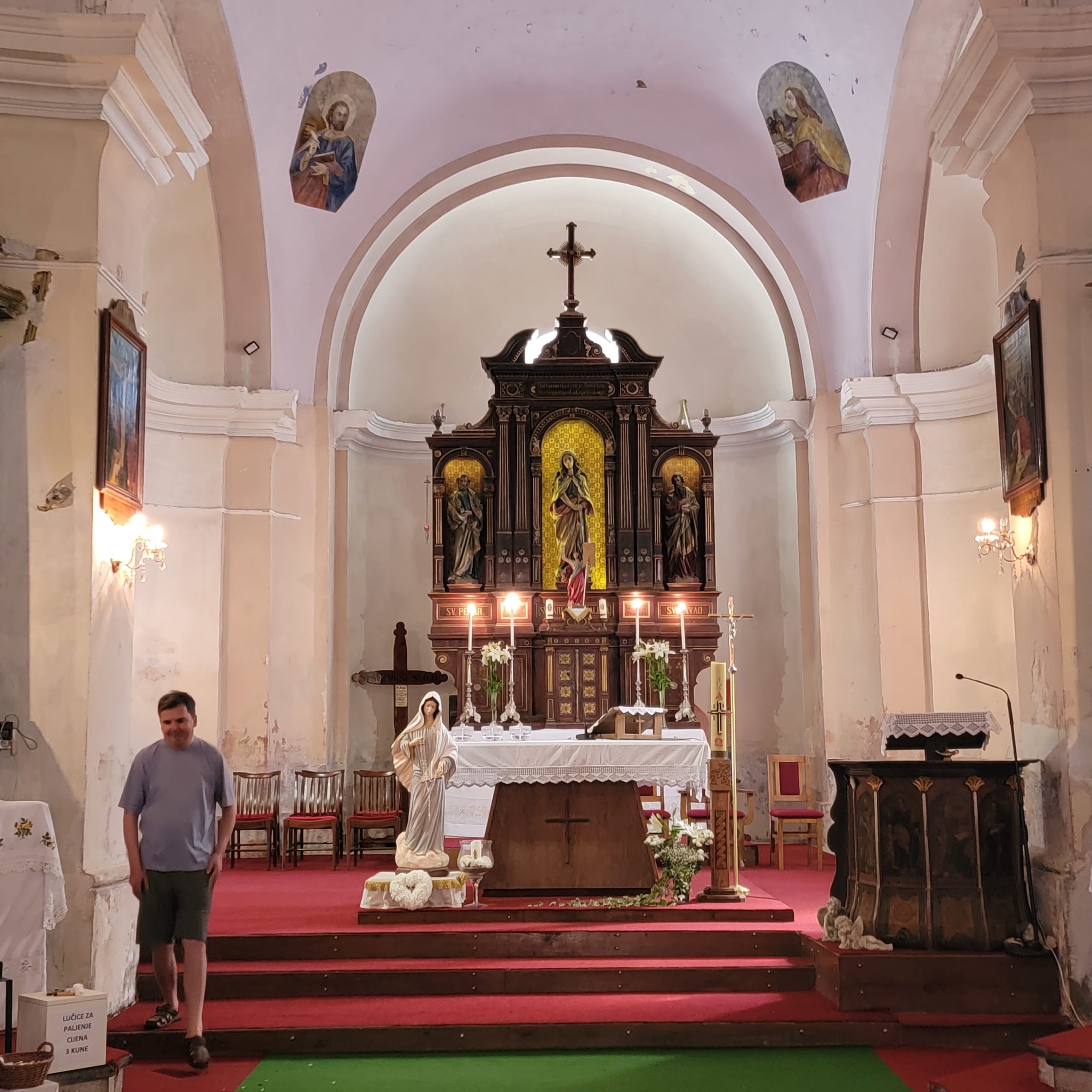 We were passing through one village and saw the church off the highway, then heard the bells ringing mid day. We stopped in the parking area and the bell ringer was in the doorway. We asked permission to see the church and he happily gave us a tour. He lived next door and was ringing the bells mid day at the request of a local family whose loved one had died recently in Canada. When the bells finished he showed us around and then invited us to see his home next door.