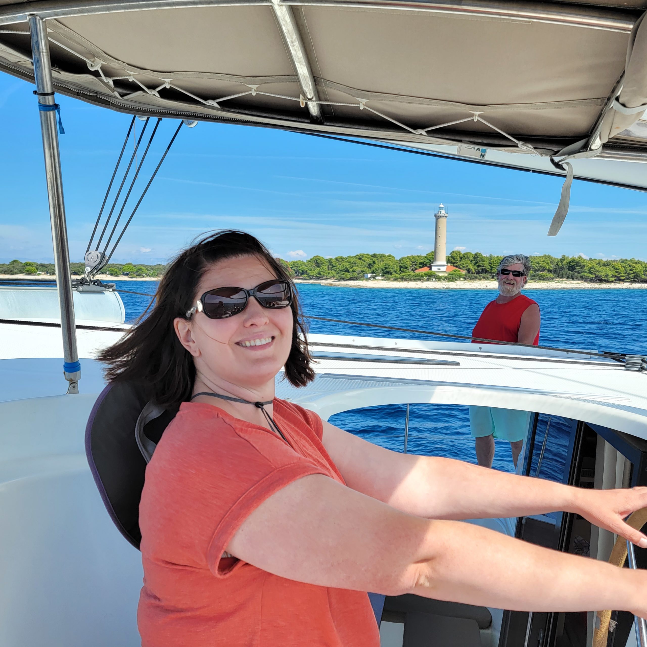 Kelly has been learning to sail on Yohelah when she’s had time for the past couple of years. This week on charter she spent a lot of time at the helm. Here she is with her dad Ken as we passed by a lighthouse on shore. I’m pretty sure they were enjoying the sail.