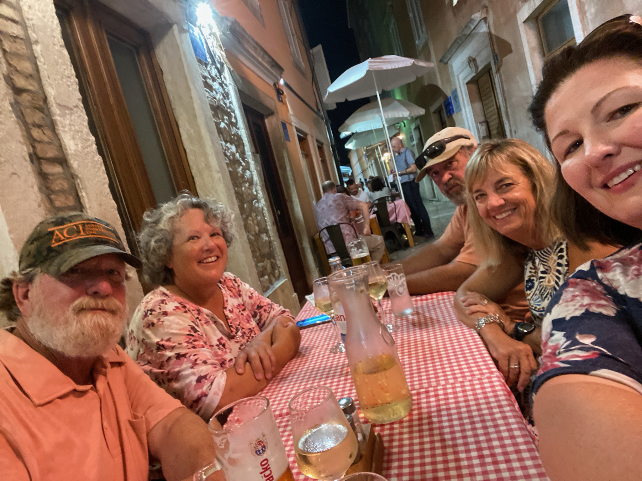 Our last dinner was back in Old Town Zadar. We had to bring the boat back the night before so we shared one last meal ashore. Rob and I look rightfully tired after 9 continuous weeks of travel, and it is definitely time to go home. It was a great charter and a fabulous visit to Croatia. Next trip for this crew – BVI in February 2024 perhaps?