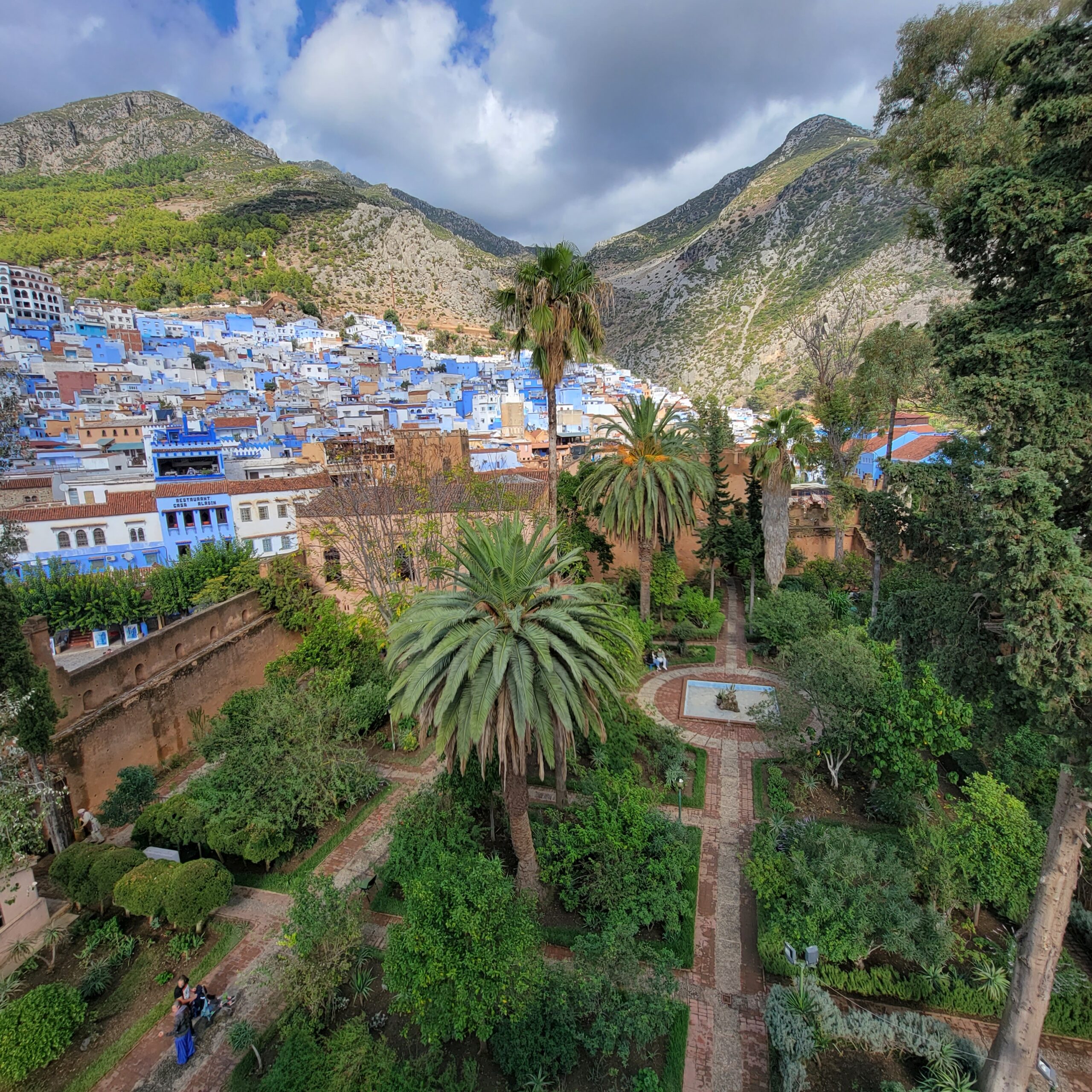 Inside the walls of the city is Kasbah Chefchaouen, a fortress that was built in 1471 by Rachid Ben Ali to protect the city. This is the view of the gardens within the Kasbah and the city beyond. You can see the city walls still exist at the upper edge.