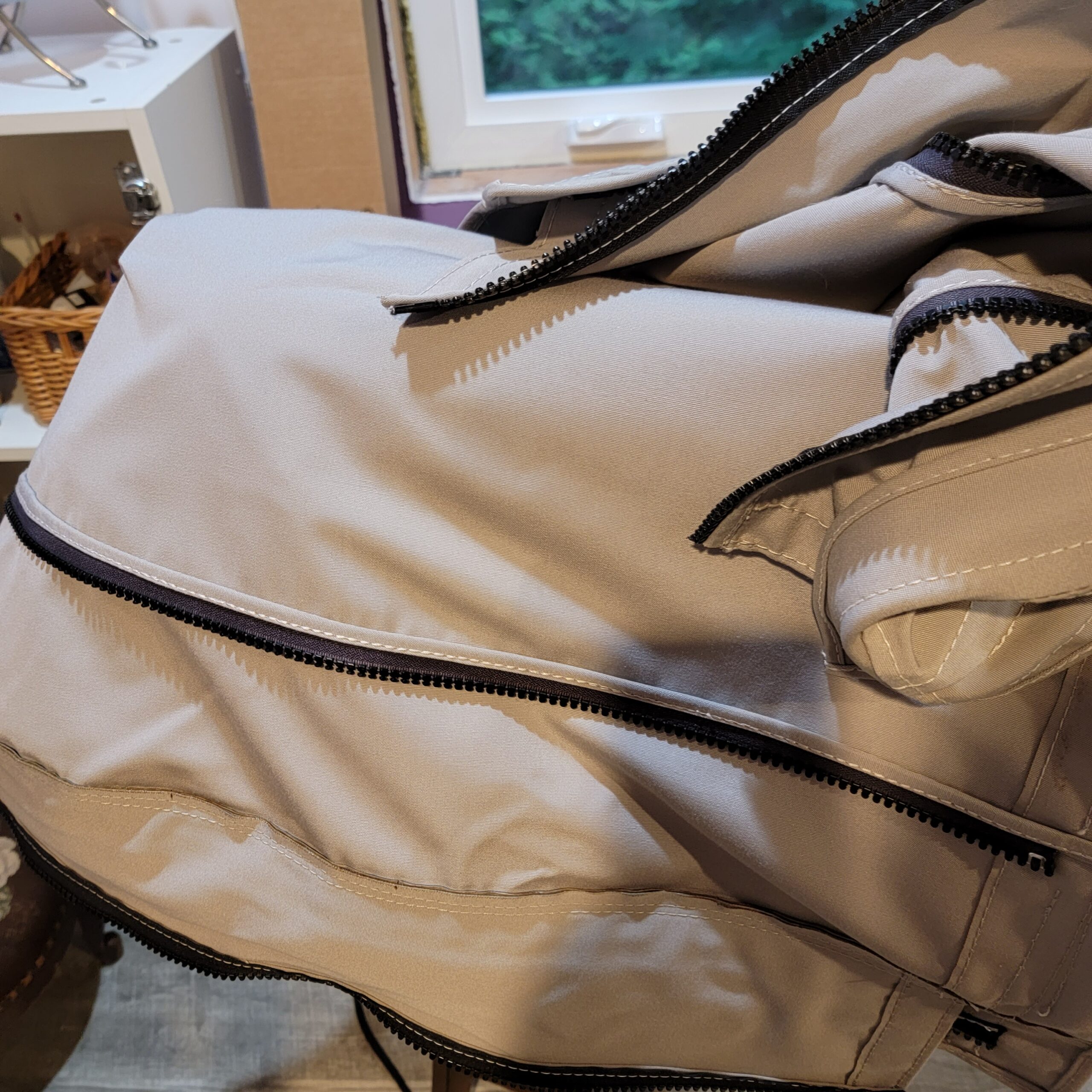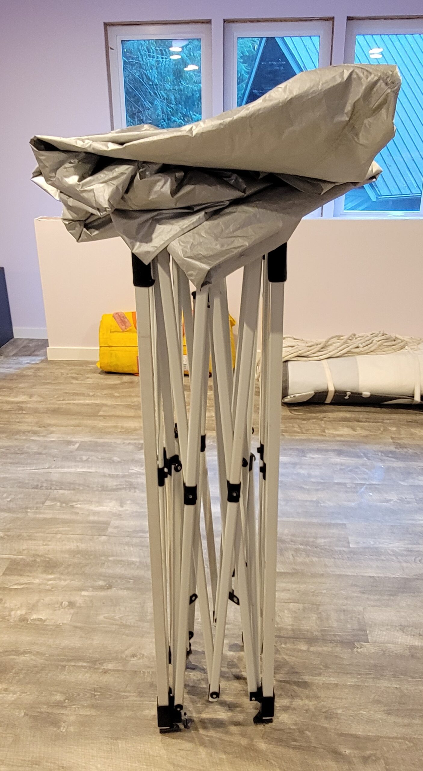 Our awning needs a replacement cover. The frame is super sturdy but the fabric is extremely flimsy. We used this all winter to keep tools dry while working on the deck. And we managed to make some really big tears in the top, catching it on various tree limbs while assembling and moving it around. We need this for our rain/sun cover this summer in Alaska, so it has to get done before June. I just need to measure and order new fabric and replicate what already exists, pretty easy I hope.