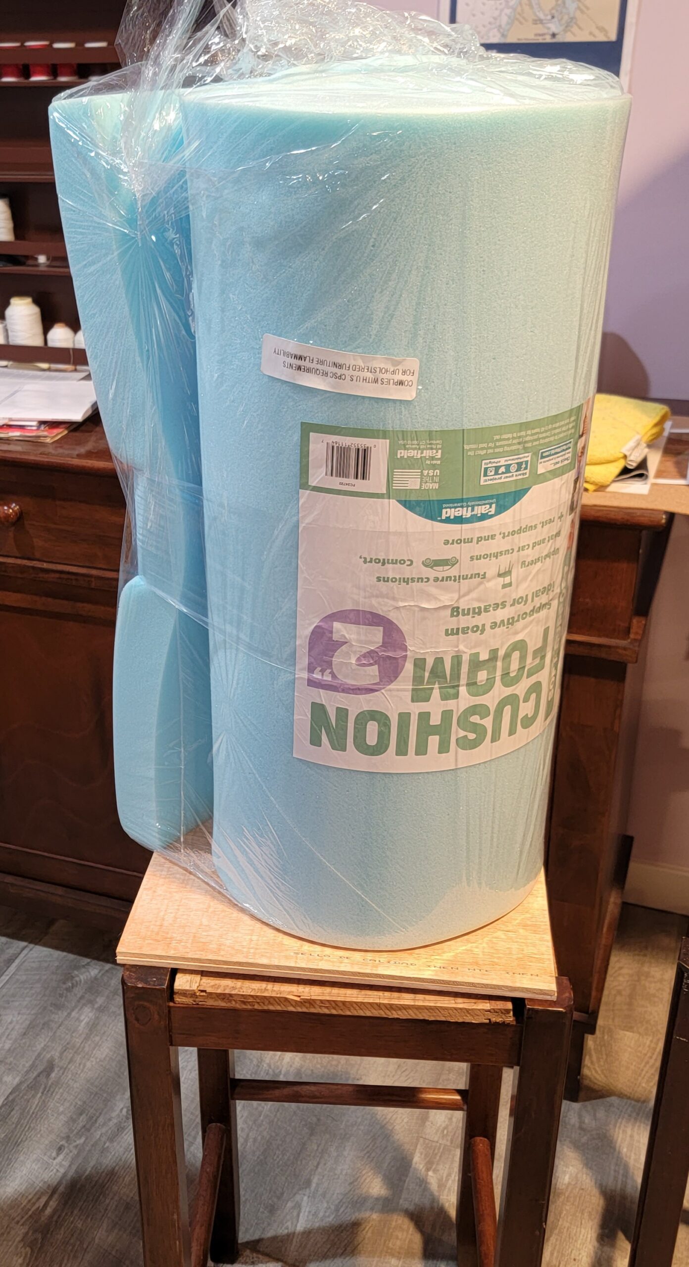 Another deck furniture project is replacing the cushions on some stools. I bought a cute little table and stools from our online yard sale, but the seat tops were rattan and not in very good shape. We cut that off and I’ll make some cushions. It’ll be good practice for the other cushions that will need to be made for other deck furniture that Rob will build.