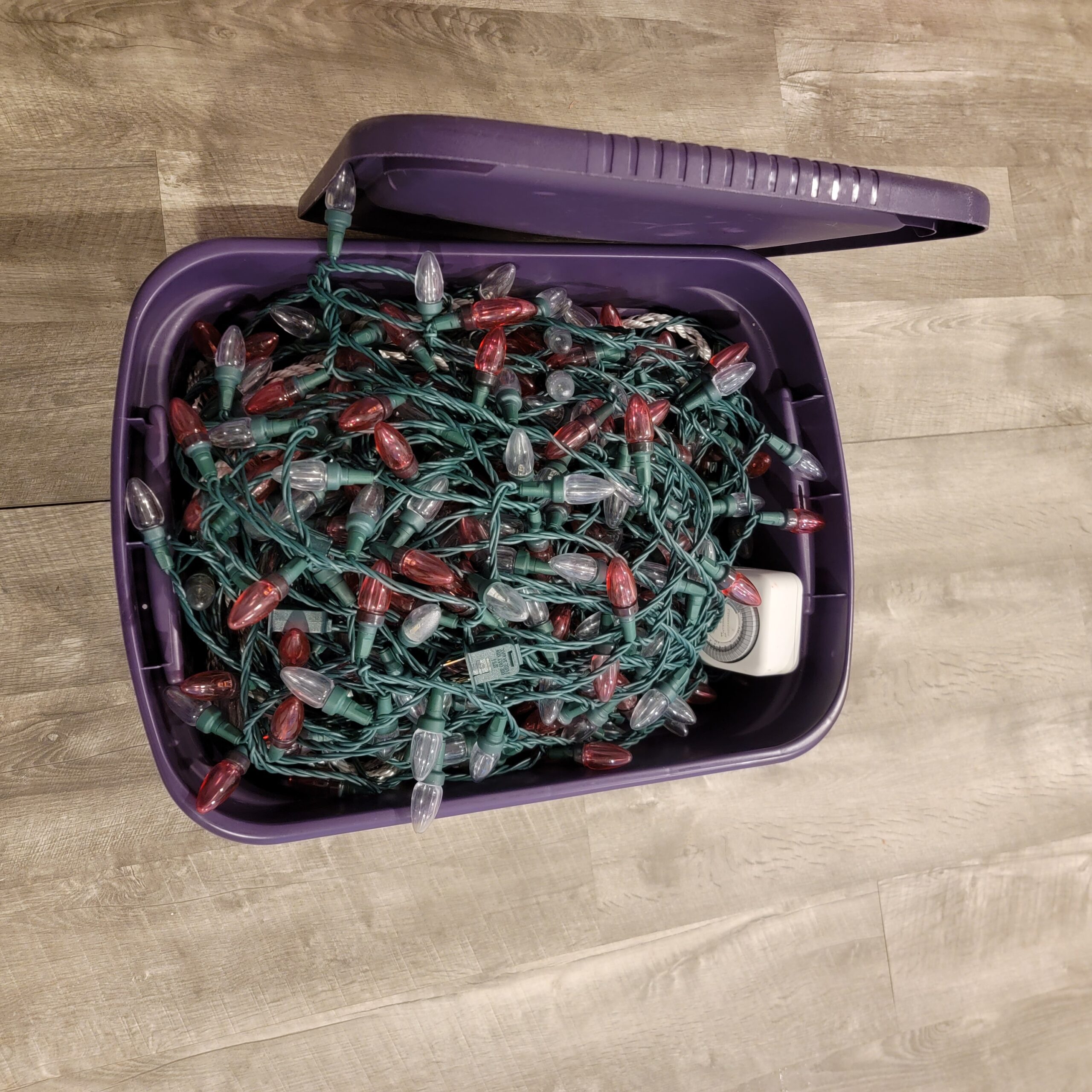 The Christmas lights that go up the mast on the boat are red and white because Rob took off every other bulb cover and painted it red. Unfortunately the red paint looks a little too pink and needs another couple of coats. I decided this should get done before I put these away for next year. Christmas Ships is one of our favorite holiday traditions, and often happens early in the season. Next year we’ll be red and white, not pink and white.