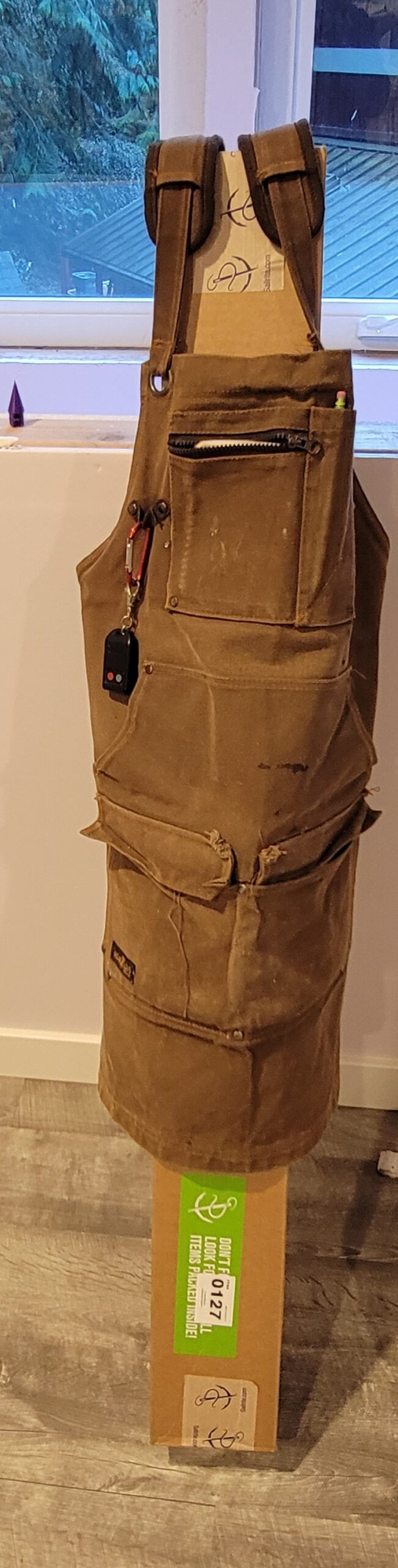 Rob has a really nice shop apron that’s starting to wear. I found a pattern and instructions on Sailrite, the website where I buy most of my supplies. So this was a Christmas present for him. The pattern is much like the one he already has, and we’ll tweak this and move some pockets around and add different hardware, now that he knows what he wants after wearing this one for four years.
