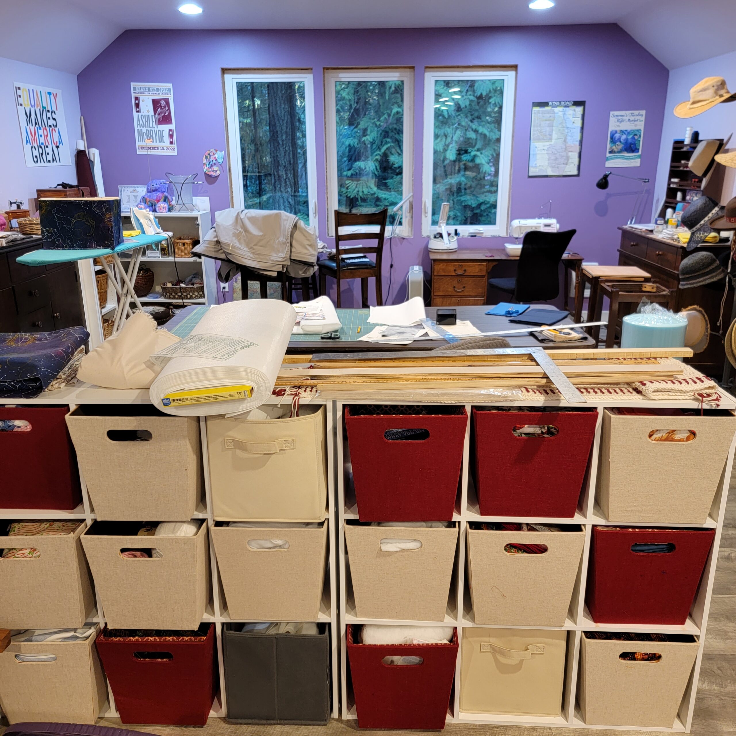 This is the sewing area of my studio above Rob’s woodshop. It’s looking a little messy right now because I have so many concurrent projects.