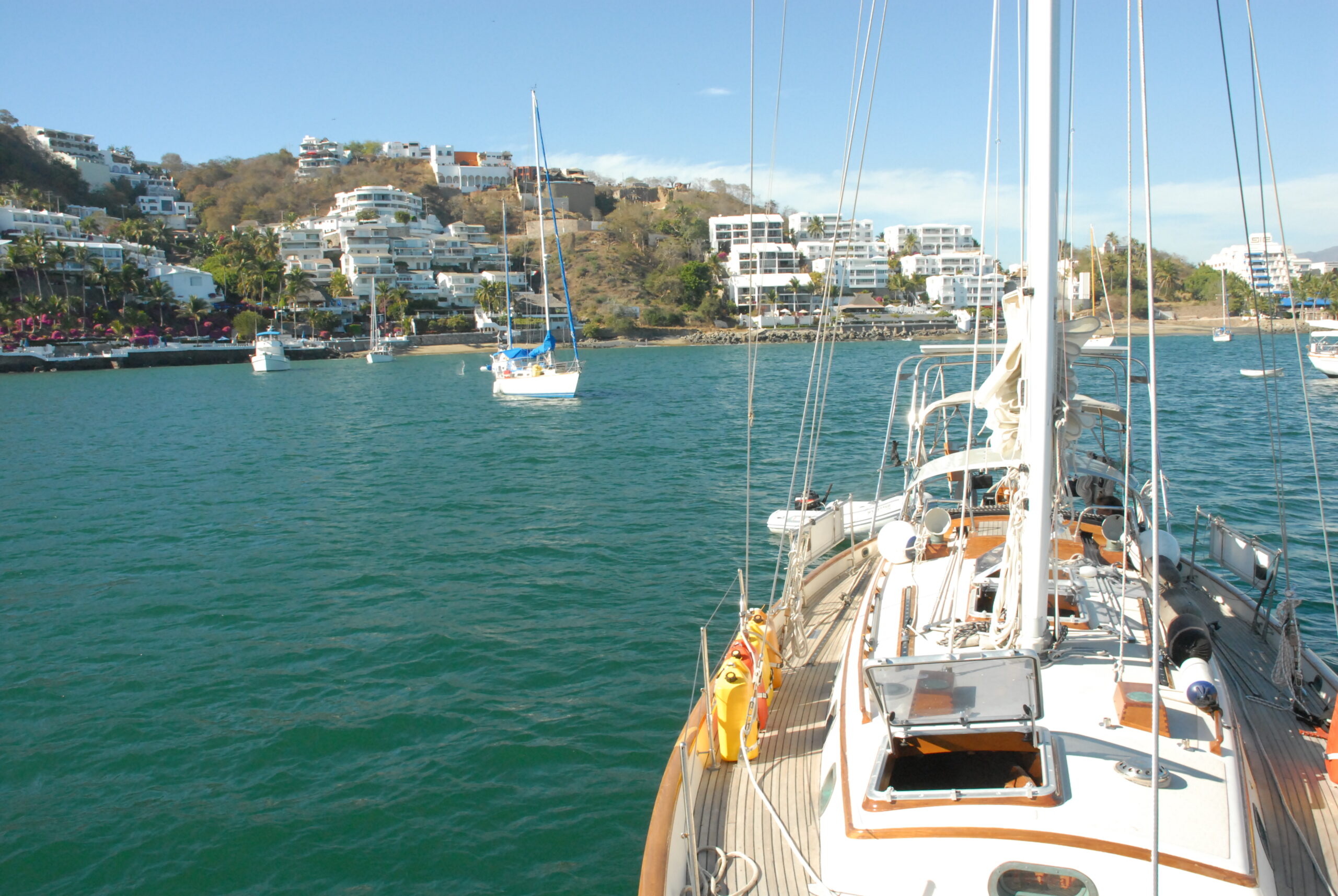 We’re on anchor in Las Hadas this morning getting ready to head south. Our trip from La Paz to Tenicatita was not as uneventful as we prefer and got interrupted by a stop in La Cruz (near Puerto Vallarta) to do some repairs to the boat. We’ve been fortunate that all the hard work we did in Seattle and Port Townsend has paid off and we’ve had few mechanical issues to deal with so far. But on the way out of La Paz we first discovered that our hydraulic vang had leaking seals when I found hydraulic fluid on the decks while dousing the sails at Las Frailes. Then on our second day of passage out of Frailes I was trying to unfurl the jib early in the morning while Rob was sleeping and discovered the spinnaker halyard wrapped around the swivel at the top. Rats. Later that day as dark was approaching and the wind had died we decided to speed up the engine and try to push for Tenicatita the next day and discovered low oil pressure in the engine. Double rats. No headsails and a questionable engine. Hmmm – time for a stopover.