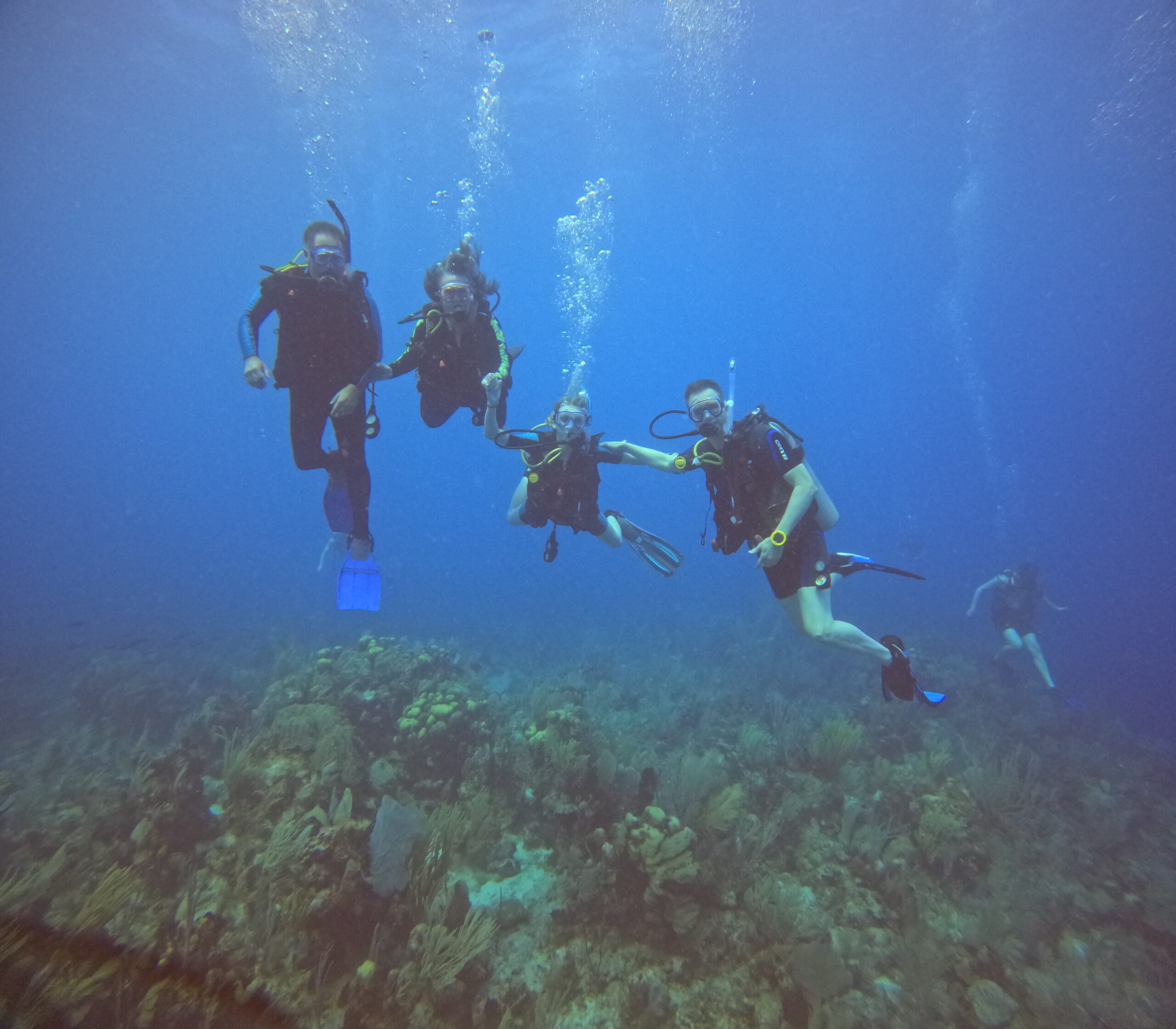 Our first dive was spectacular. We were picked up and had a 90 minute high speed boat ride to the edge then outside the barrier reef into the Caribbean Sea to Glover Reef. We had two dives with lunch between. The first one (Jenna’s first warm water dive ever) was spectacular, taking us through and around underwater pinnacles covered with coral and teeming with marine life and fishes of all kinds. The boat ride was long but worth every second.