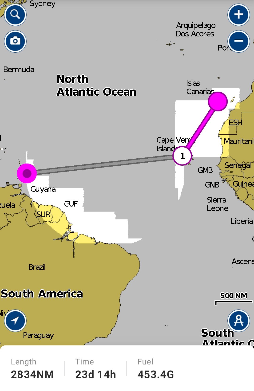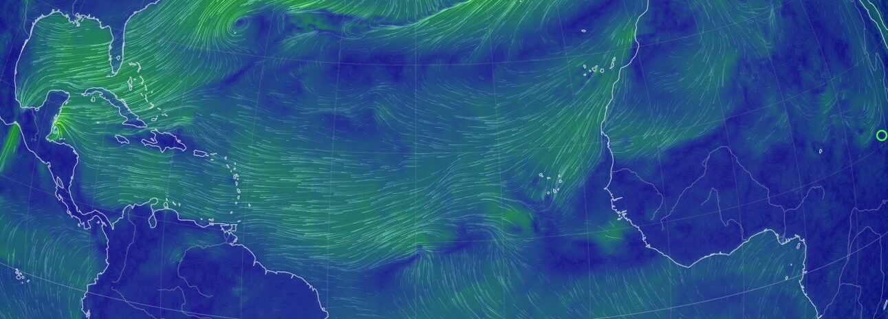 Now I get to learn a few things about weather in the Atlantic. We’ve all heard about the “Horse Latitudes”, and you can clearly see them (the dark blue at 30 degrees north where there is no wind) in this image from https://earth.nullschool.net above which shows the current global wind patterns. When we crossed the North Pacific in 2010, we were careful not to sail into the North Pacific high pressure system where there is no wind in the middle of the Pacific. Our route will be much like that, staying where the tradewinds blow.
