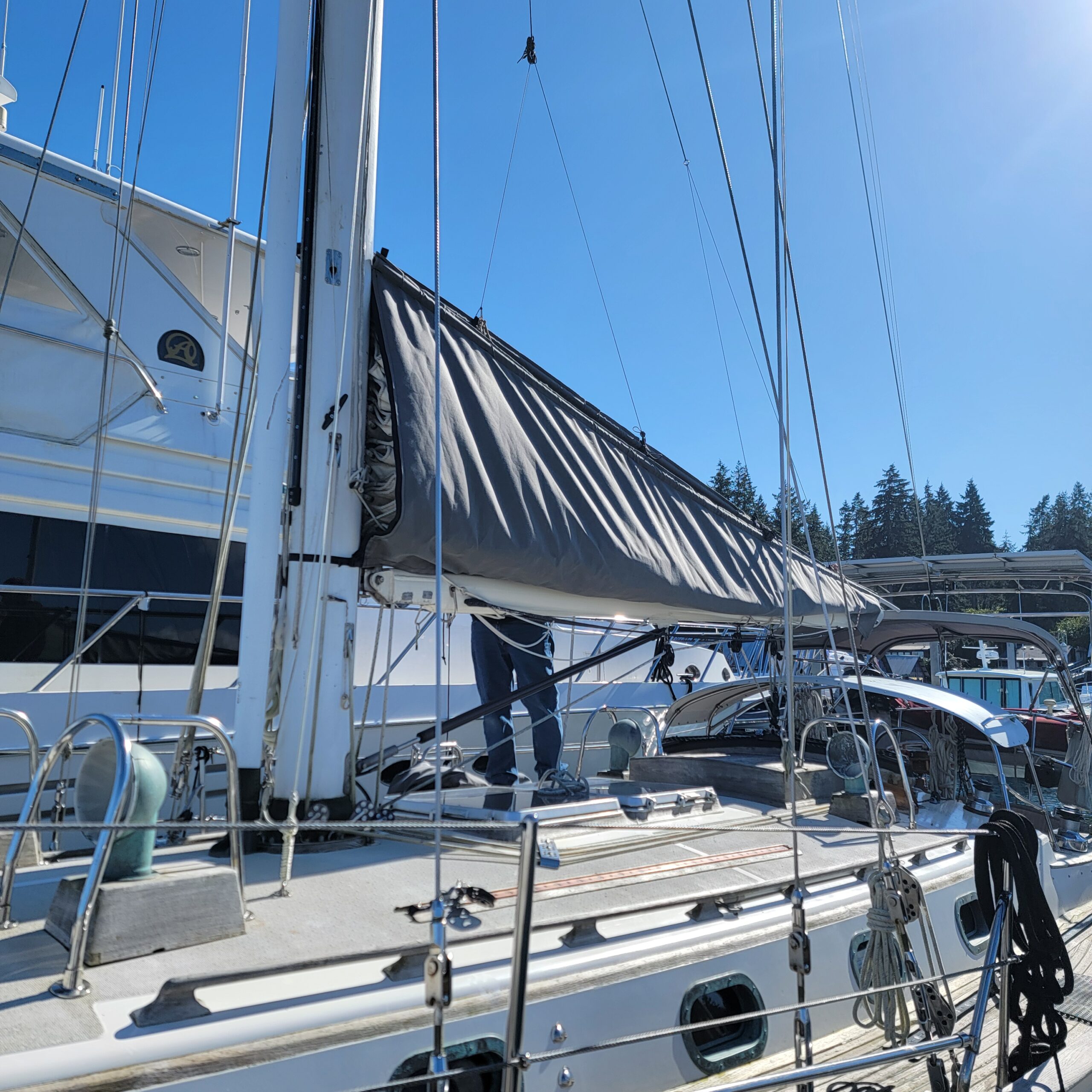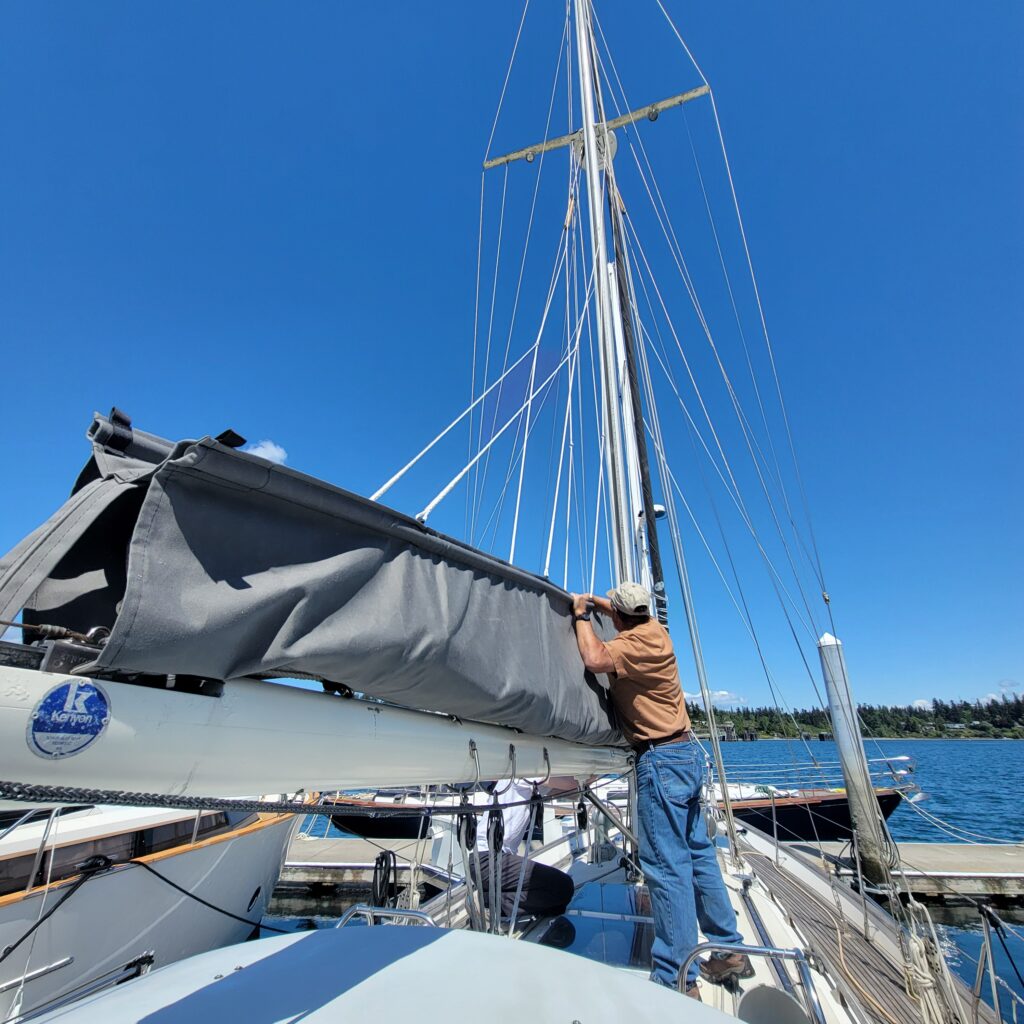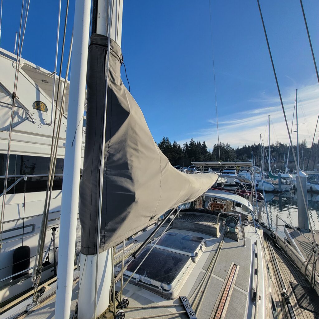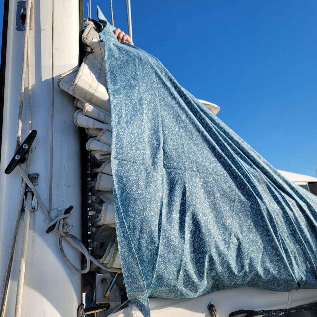 Goal #1 with Yohelah is to make her easier to sail. First on the list, and easiest to accomplish is getting rid of the sail cover. It’s big and heavy and too high up for me to easily reach. Going out for a day sail means taking it down, stowing it away below, then reinstalling. The answer is a stack pack, which is a is a modern type of sail cover. It is secured to the boom and zips closed at the top to protect the sail from sun damage when it’s not in use. No more taking down the sail cover, it just stays attached to the boom.