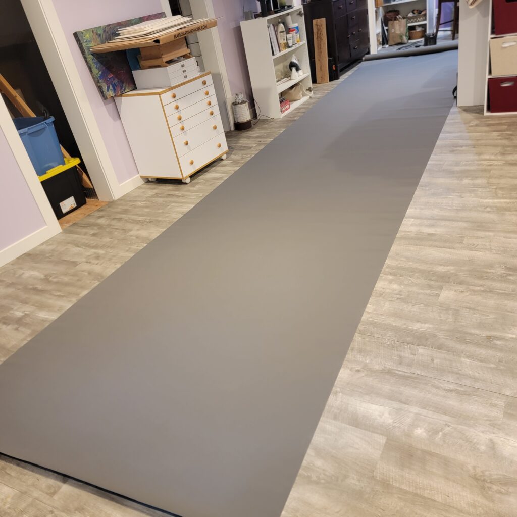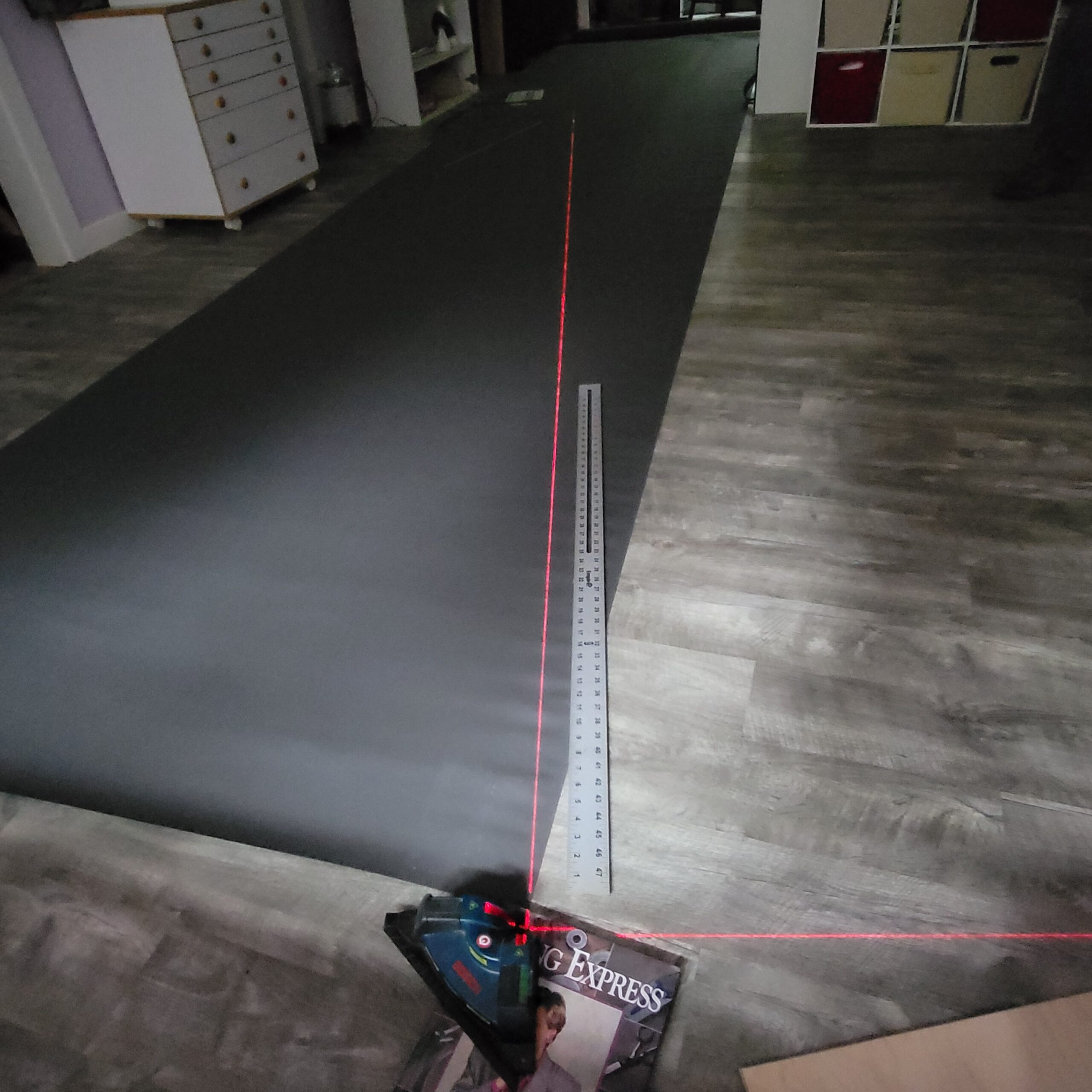 I used Rob’s laser level to create the 15 foot line down the length of the fabric.