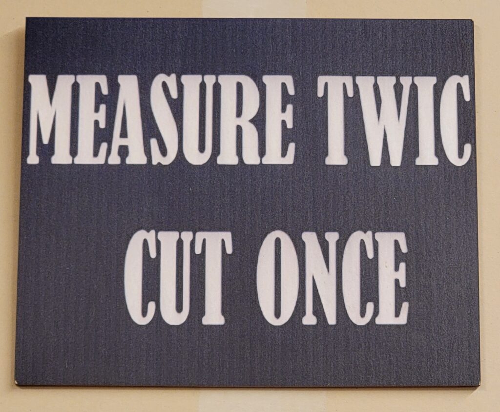 This is a sign in Rob’s wood shop. Making the first cut on all that fabric truly was scary.