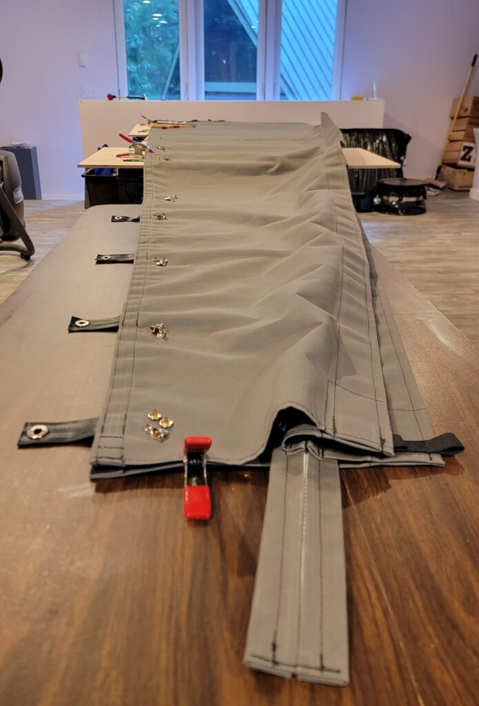 Sailrite is the company that I buy sewing supplies from, and they have a video with instructions to build your own, and a parts list of all the things I’ll need. First on the agenda was to make a prototype of the forward end to be sure that the 60″ width of the sunbrella was enough to zip up over the top of the headboard on the main sail.