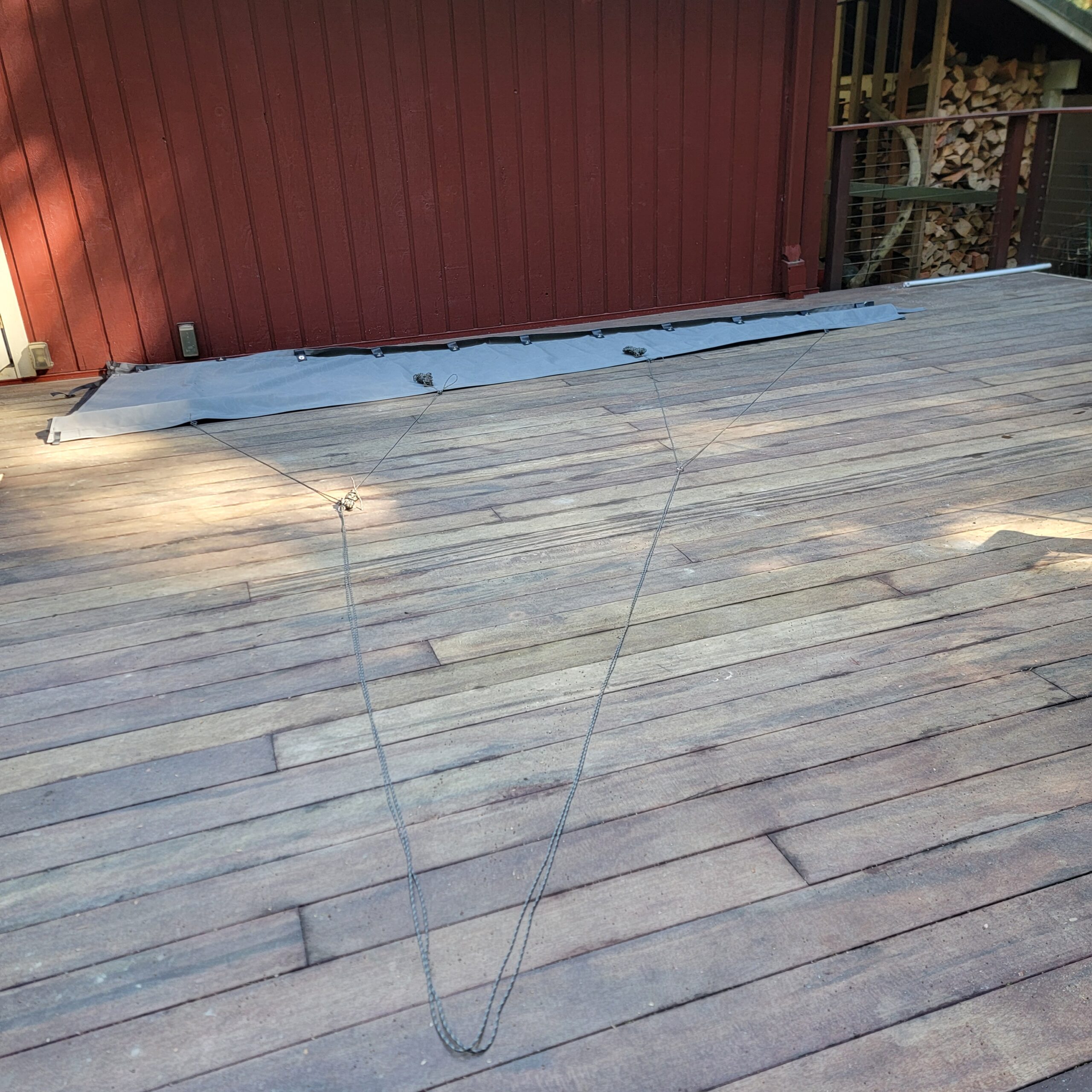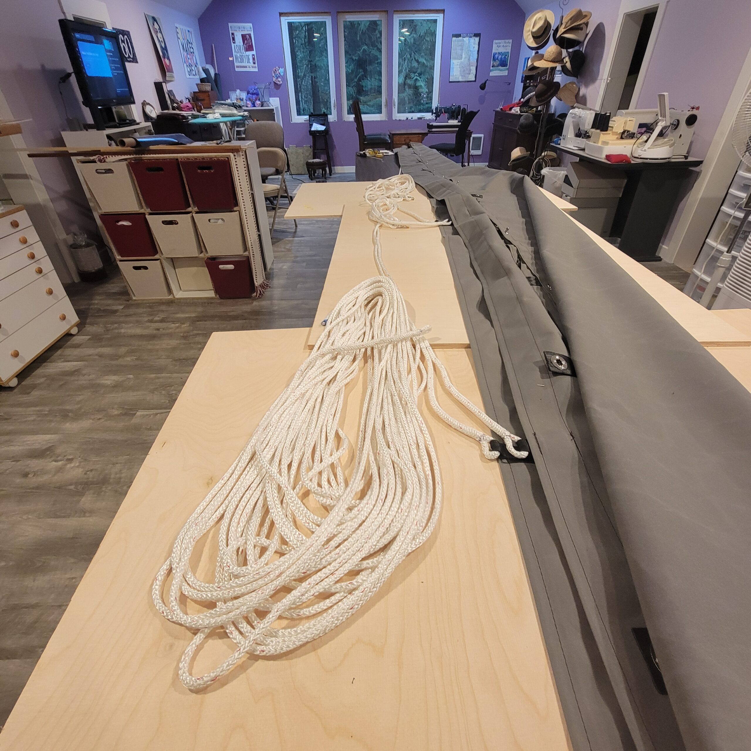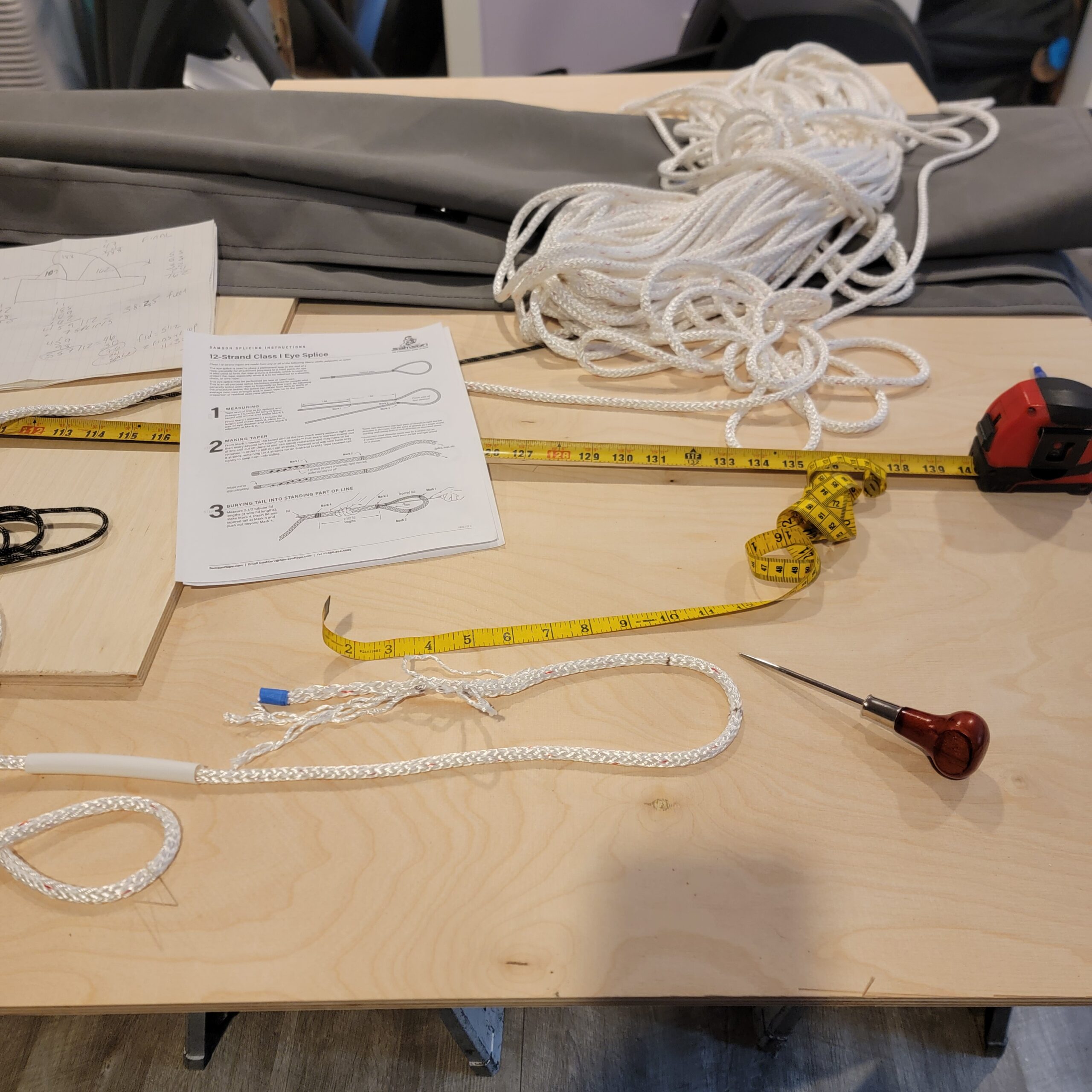 Once the cover was built I had to do a bunch of triangle math to figure out how much line to buy and how long to make each leg of the lazy jacks. This is how the stackpack is supported, and what controls the sail as it’s dropped back into the bag. We already have lazy jacks on the boat but they’re 25 years old and past due to be replaced. What I knew was that the block on the spreaders was 22.5 feet above the top of the stack pack and there were four attachment points. Then it was a bunch of math to calculate how much line to buy and how long each leg would be.