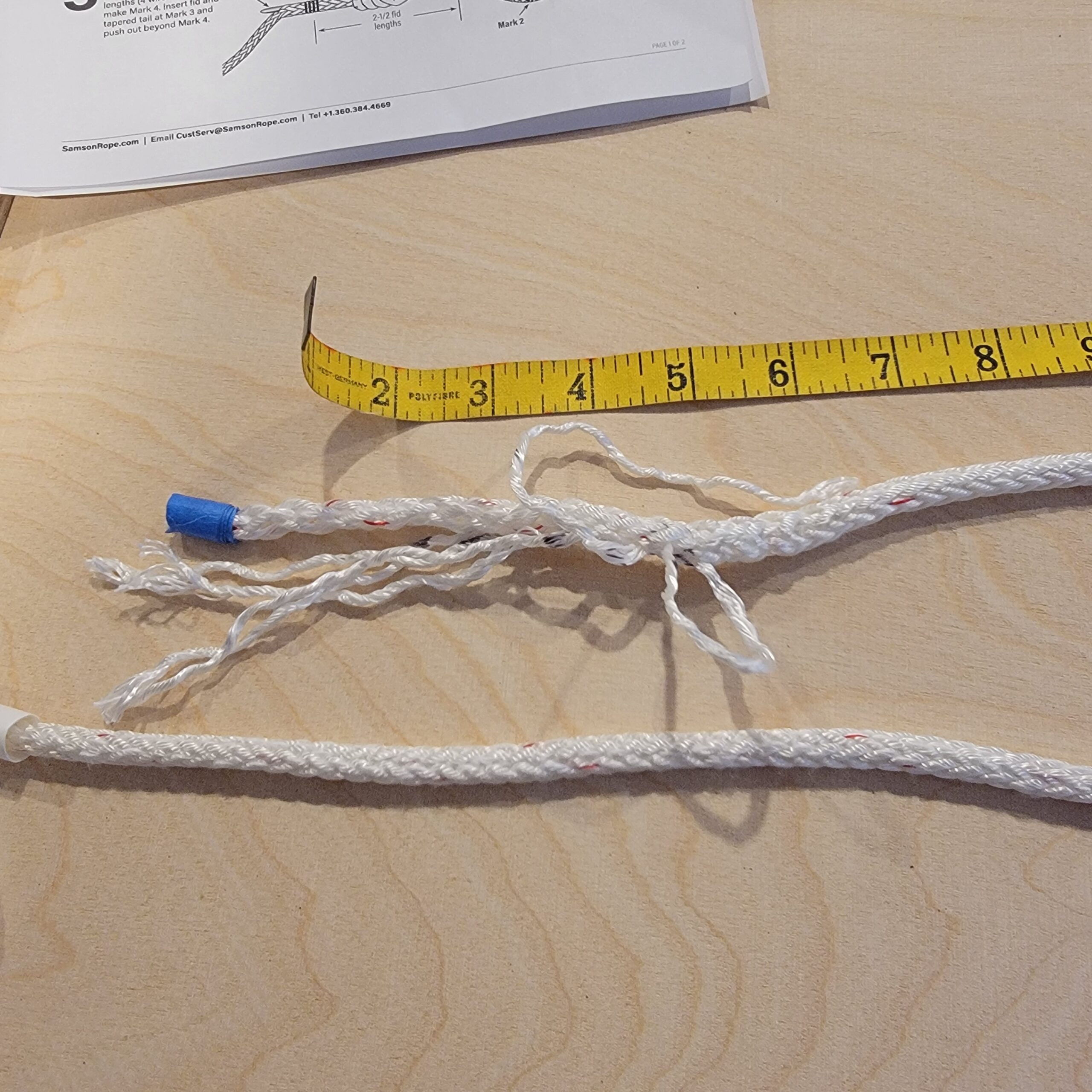 To make the splice you make four different marks on the line, pull out half of the threads at different lengths to make a taper at the end, then push the wand in the hollow of the line and pull the end into the core.
