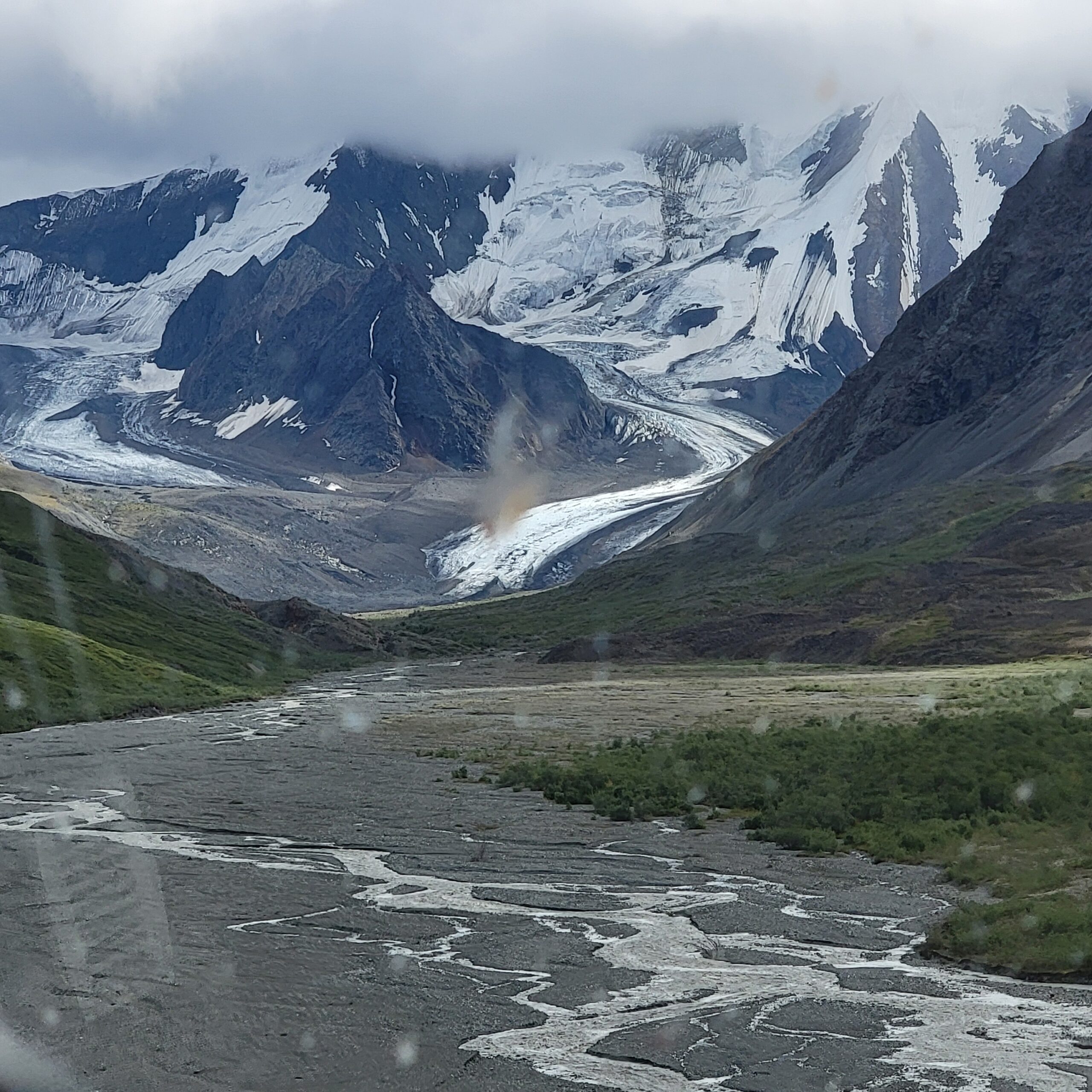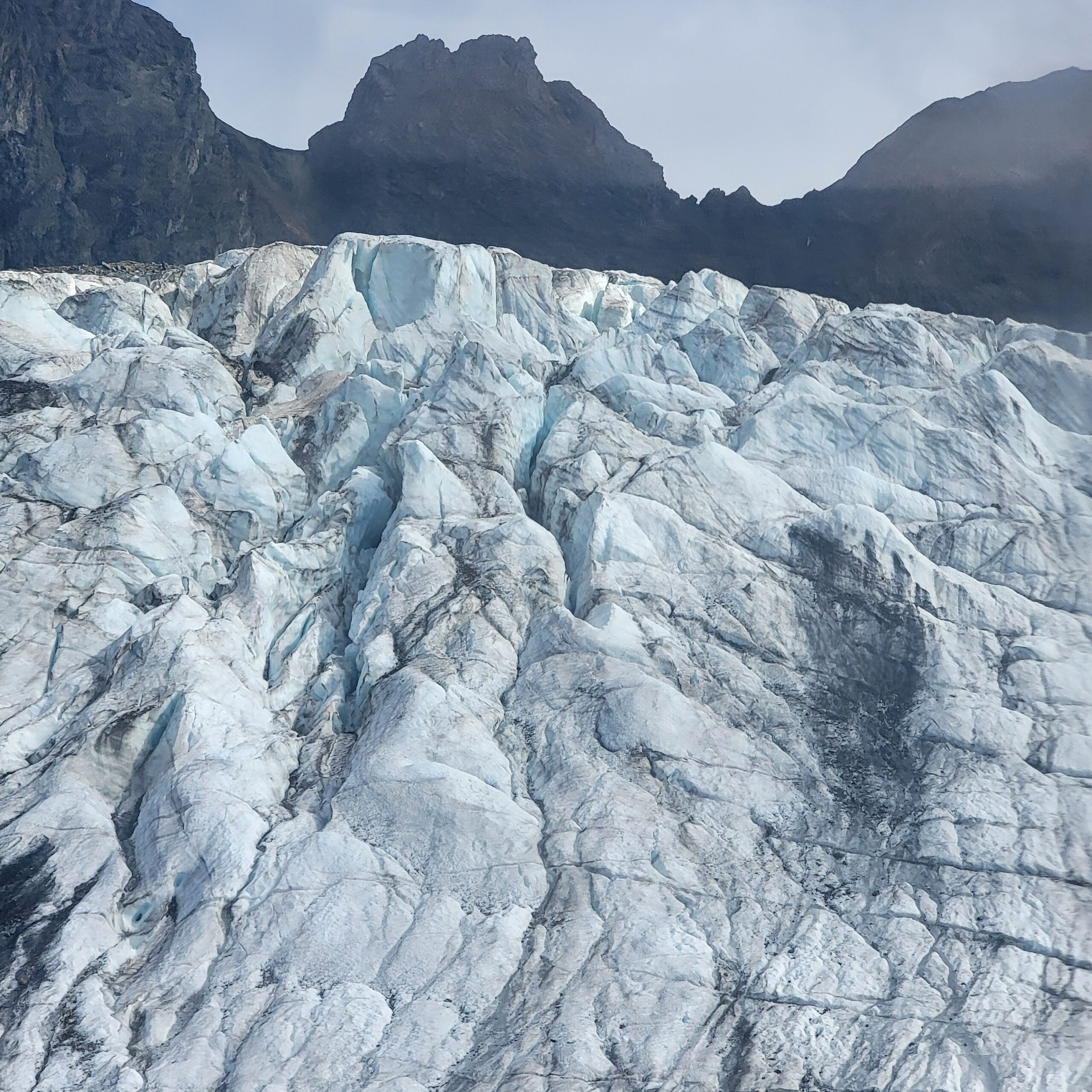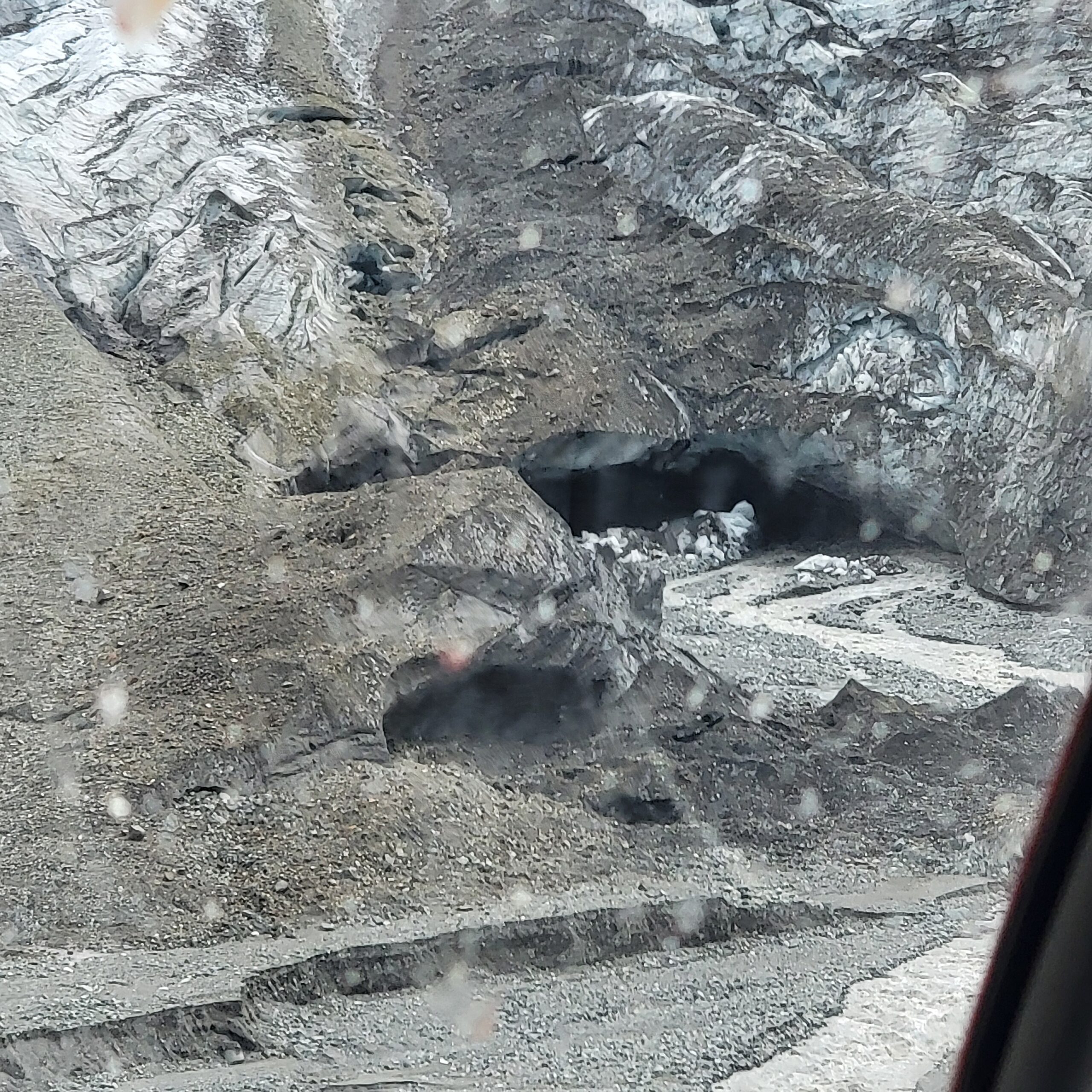 So Alex took a right turn at the end of Cody Creek and went up to the headwaters of the Wood River. Debs’ dad had owned land up there many years ago, and Bonni had worked up there at a lodge for many years. Neither had seen the area from the air. Alex flew us up to the glacier that feeds the Wood River and we saw some ice caves at the bottom.