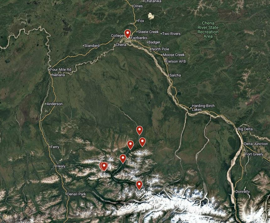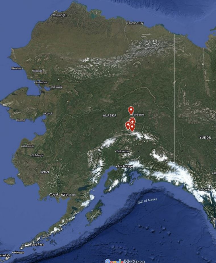 Where were we? This first map is high level Alaska. Fairbanks is the top red marker, Wood River Drainage in the foothills of the Alaska Range is south.