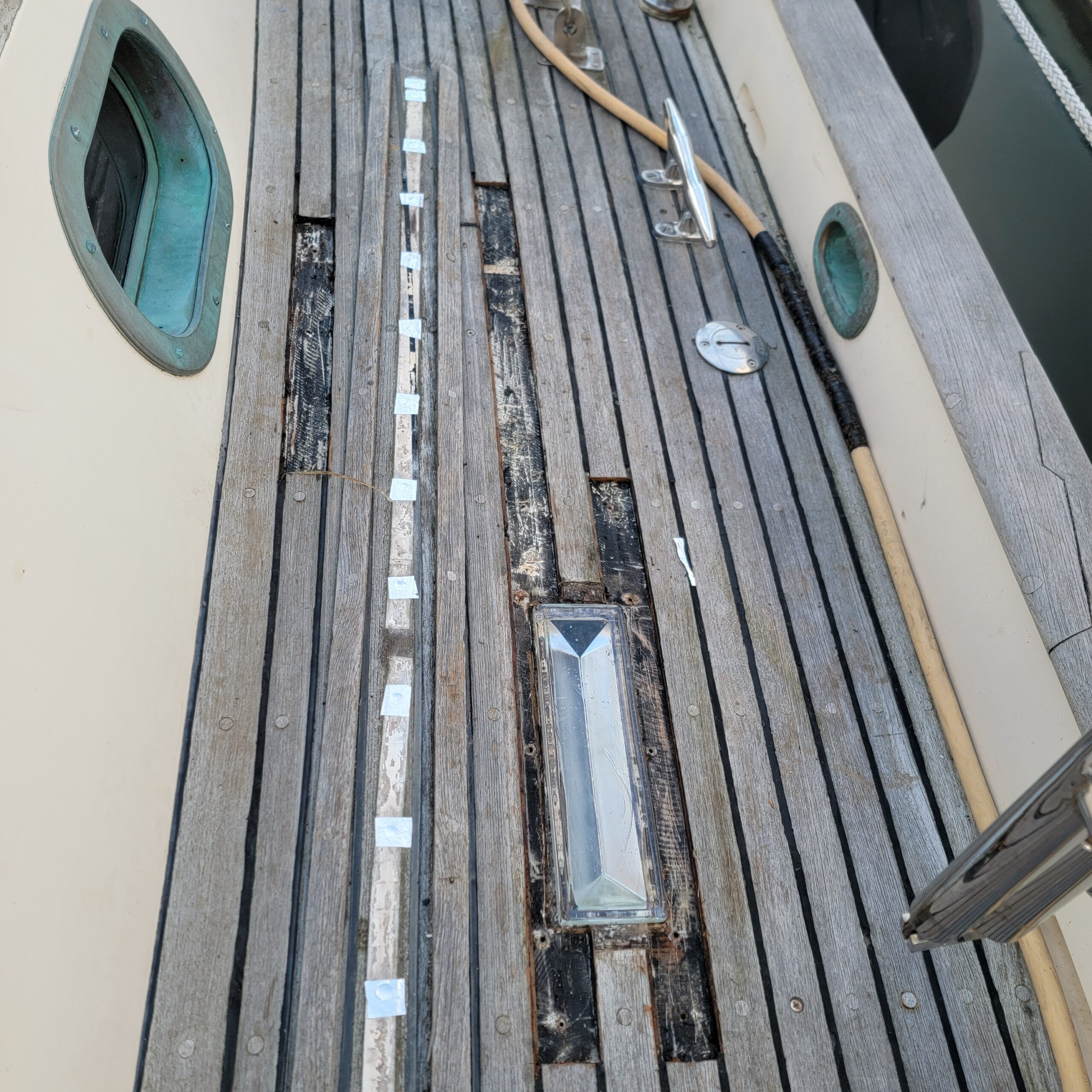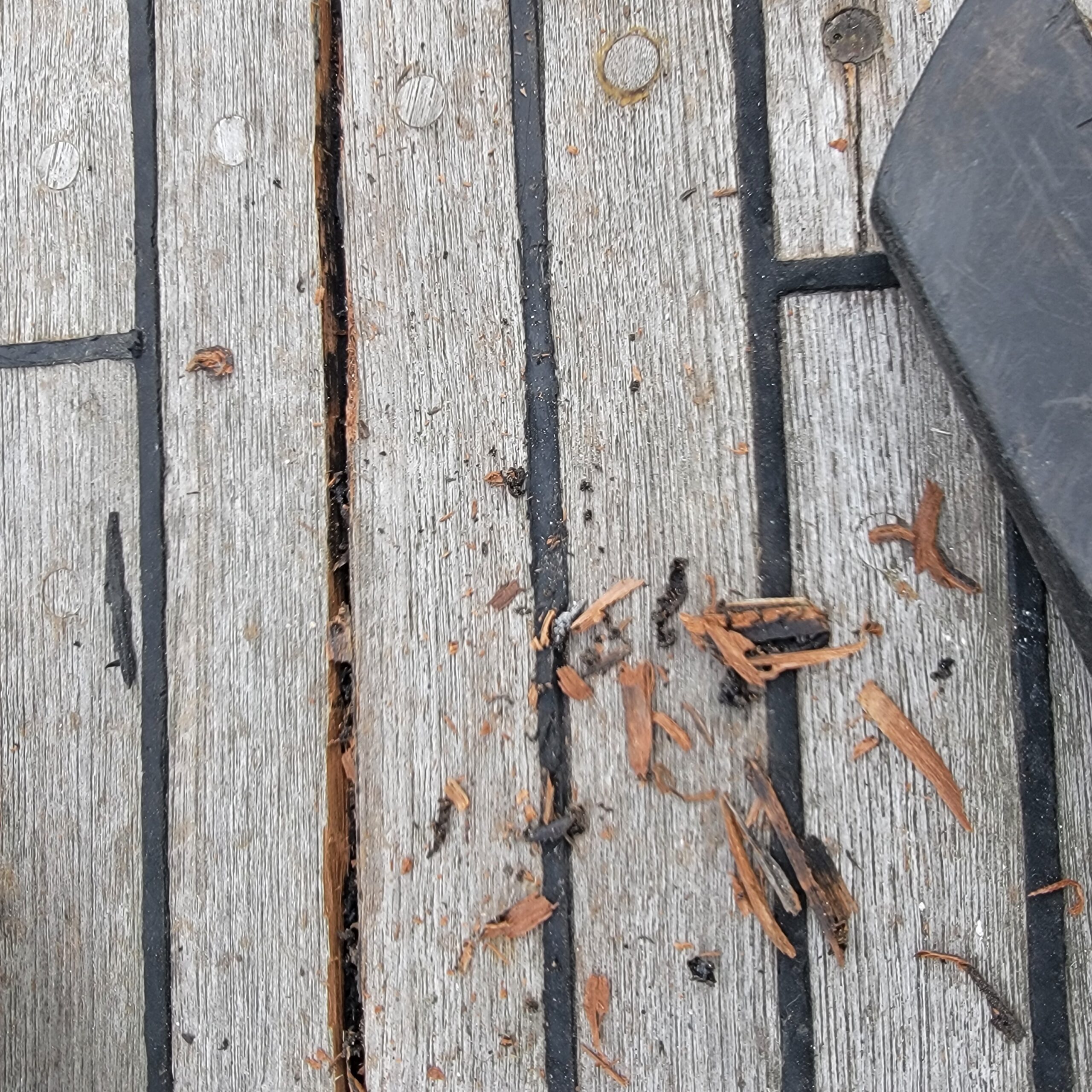 He has to pry up each broken board, make a wax prototype to verify the shape, then he goes into his shop and replicates the boards. Of course teak is very expensive, and none of these boards are straight, so each board has to be shaped to the curve of the deck. Also, when the sealant between the boards gets too thin it loses adhesion and we have to dig down deeper into the gap and reseal.