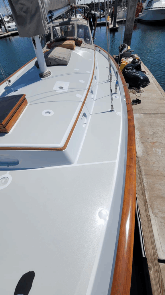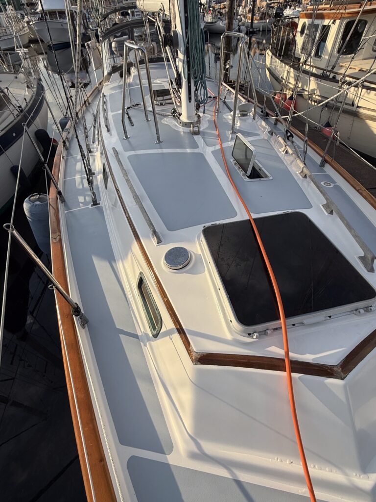 Two of our pals in our Bainbridge sailing tribe have a Passport 40, which is of the same vintage as Yohelah. They also had failing teak decks and found “the guy” last year who would replace them. We called up Ethan and made an appointment for him to come to Eagle Harbor and have a look at our upcoming project. He gave us absolute confidence that this job will be done right, so we signed up for his services starting in September. This is Rounder above, and we have all the confidence that Yohelah will look just as good when she comes back home.