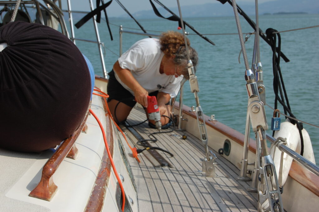 The old adage that “Cruising means working on your boat in foreign ports” is absolutely 1000% true. The decks took a lot of wear while we were offshore. Here I am in Ecuador, drilling deck bungs. We’re home now, but the decks continue to get used and the boards wear thinner and thinner every year.
