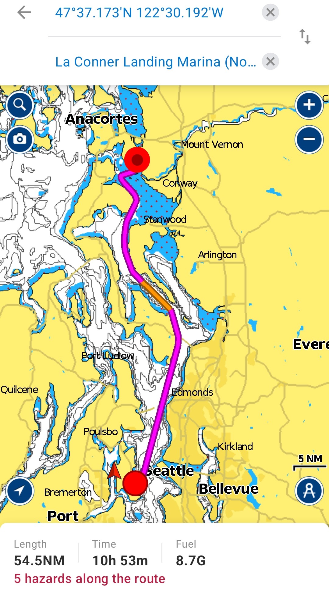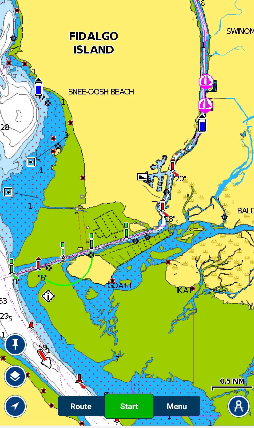 Then on Tuesday morning we’ll be very happy we have that same flood tide, as we need to transit the Swinomish Channel. The entrance has 4′ of water at low tide, and we draw 6′. It’s a very skinny channel that we’ve managed to avoid for 25 years. But the trip outside and around would mean going up around Anacortes and adding another 20 miles to the trip. Then we would still have to come south in the Swinomish Channel, so there’s no win there either.