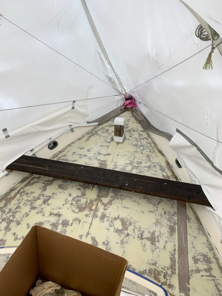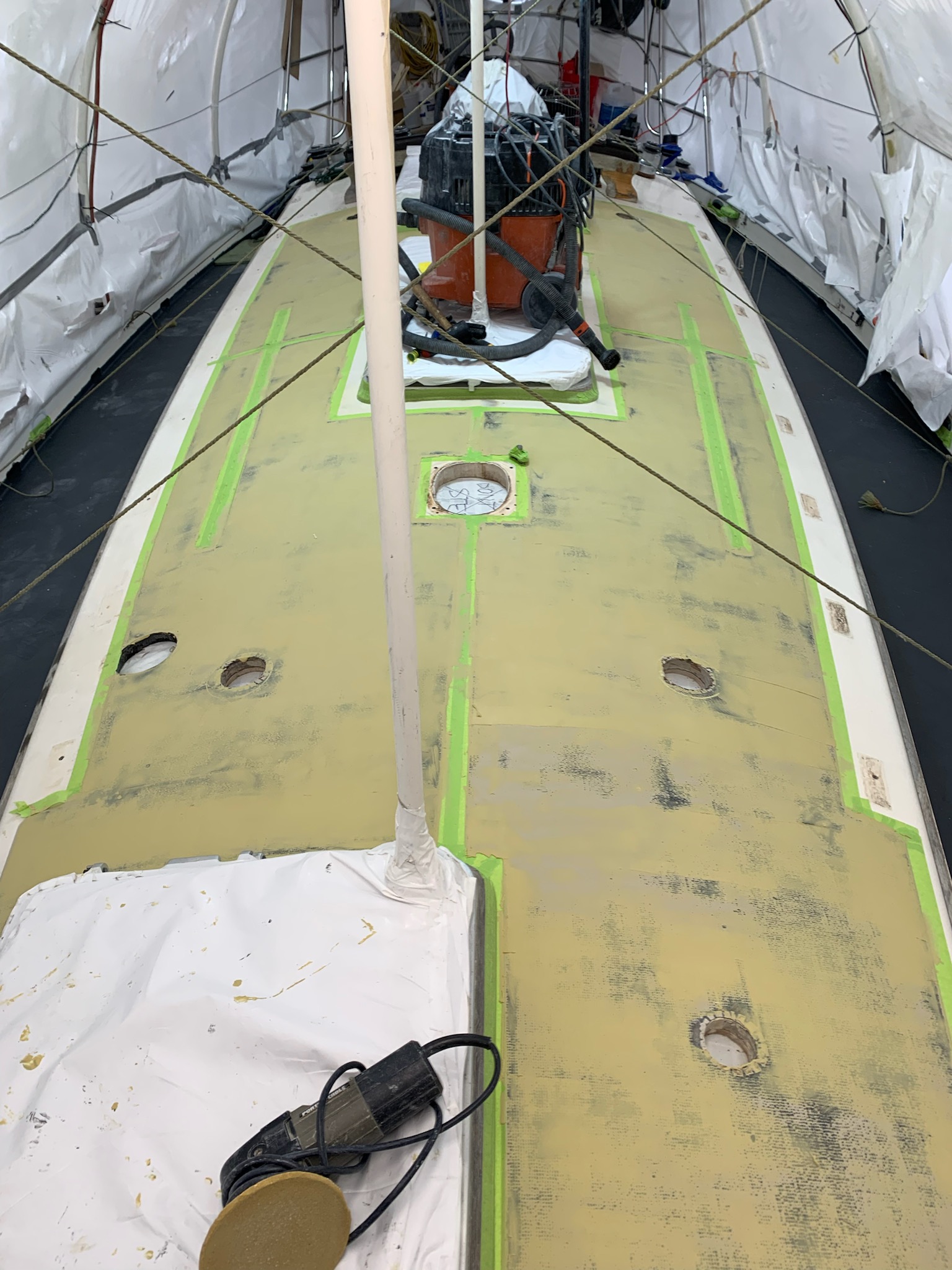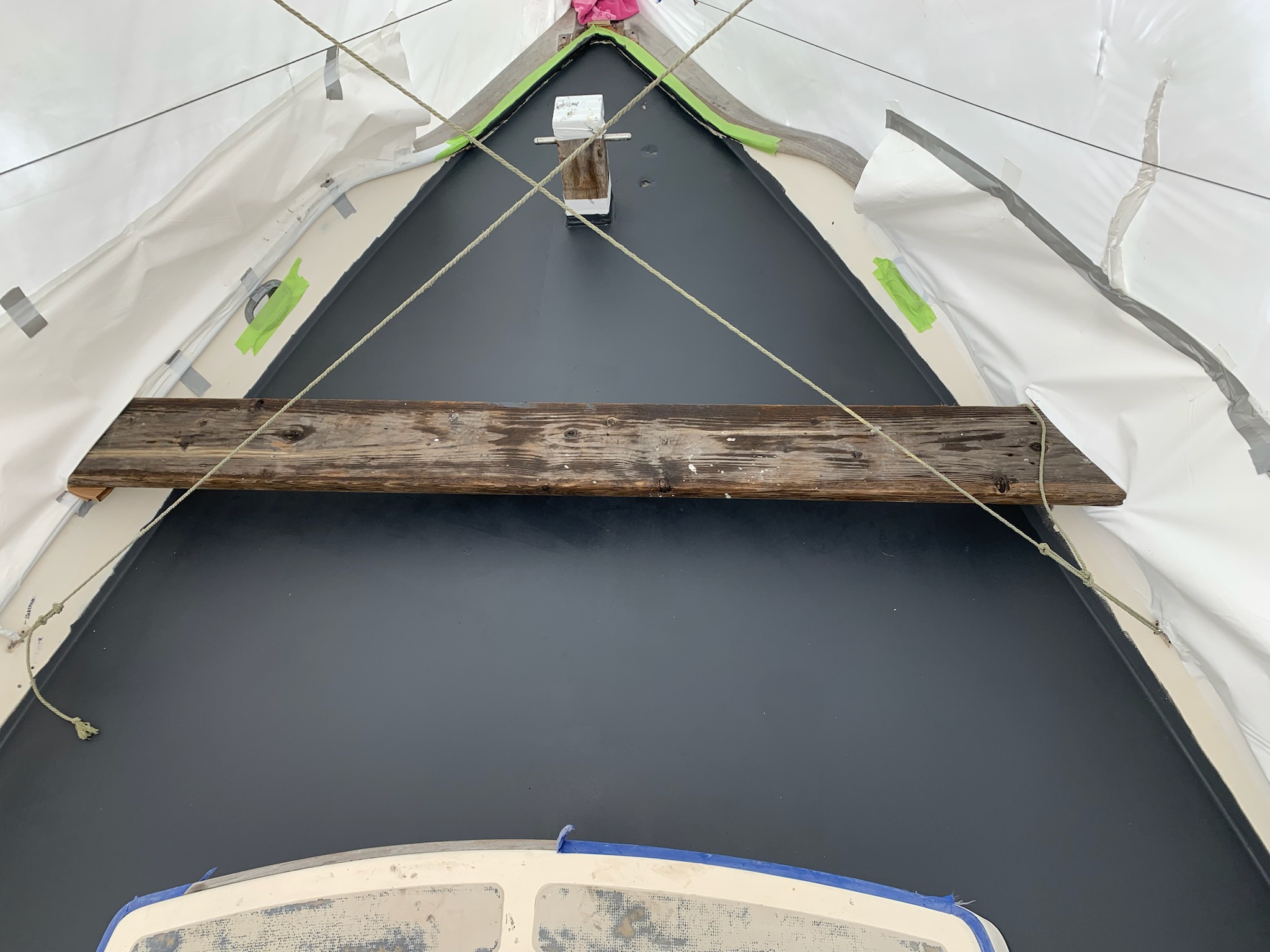 A plank across the foredeck gives access to lay on the primer and leave the space pristine and ready for sanding.