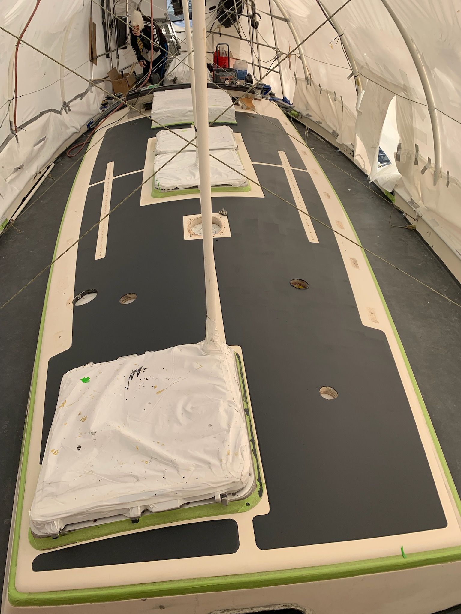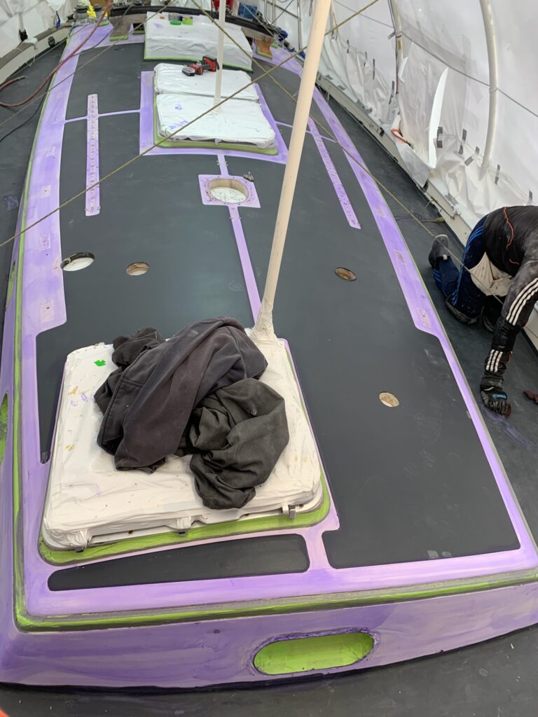 This is the primer on the foredeck. This primer has a built in guide coat to help sand for a perfect finish. Again from google: A guide coat is a thin, contrasting layer of paint or powder applied to a surface, typically after priming, to reveal imperfections like scratches, pinholes, and low spots before sanding. It is used to ensure a smooth and even surface by showing exactly where to sand and by what extent to continue sanding until the guide coat is completely removed from the high spots.