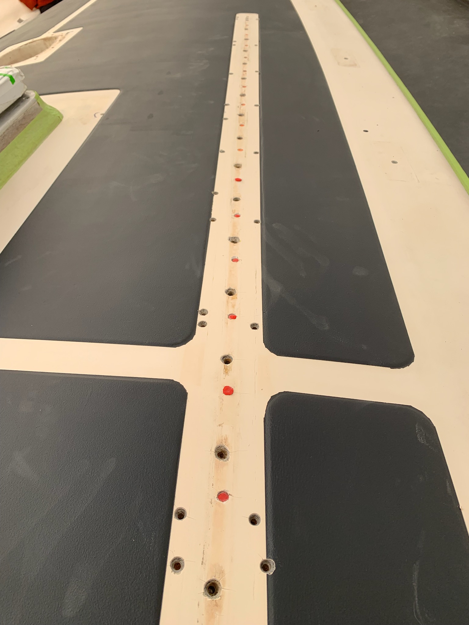 Now is the time to repair old holes. When we did the original refit in 2005 the staysail track was changed from a Schaeffer to a Harkin. The old holes had been filled with epoxy and hidden below the new track. Now was the time to clean that up.