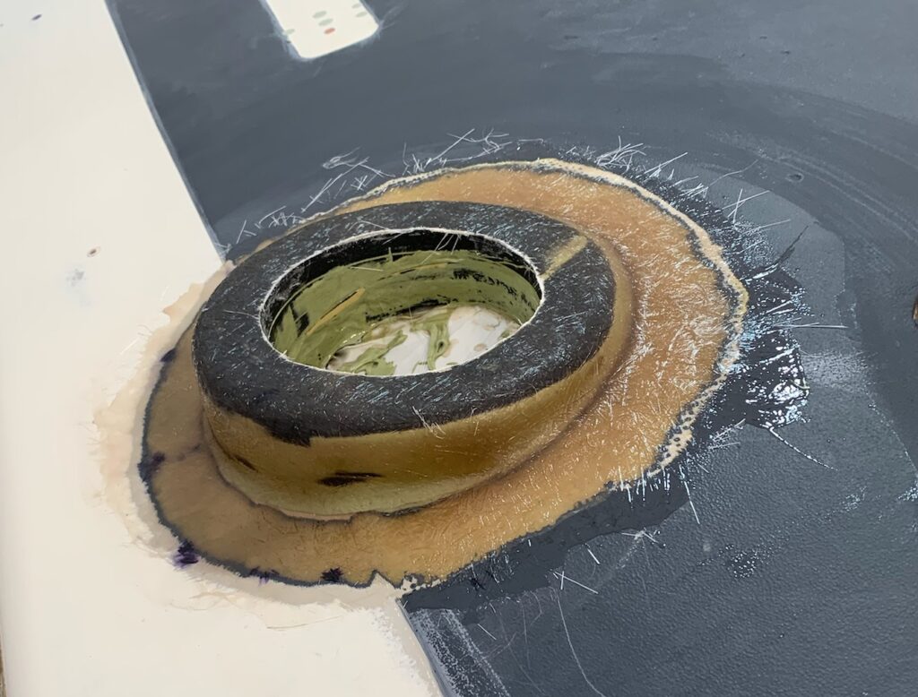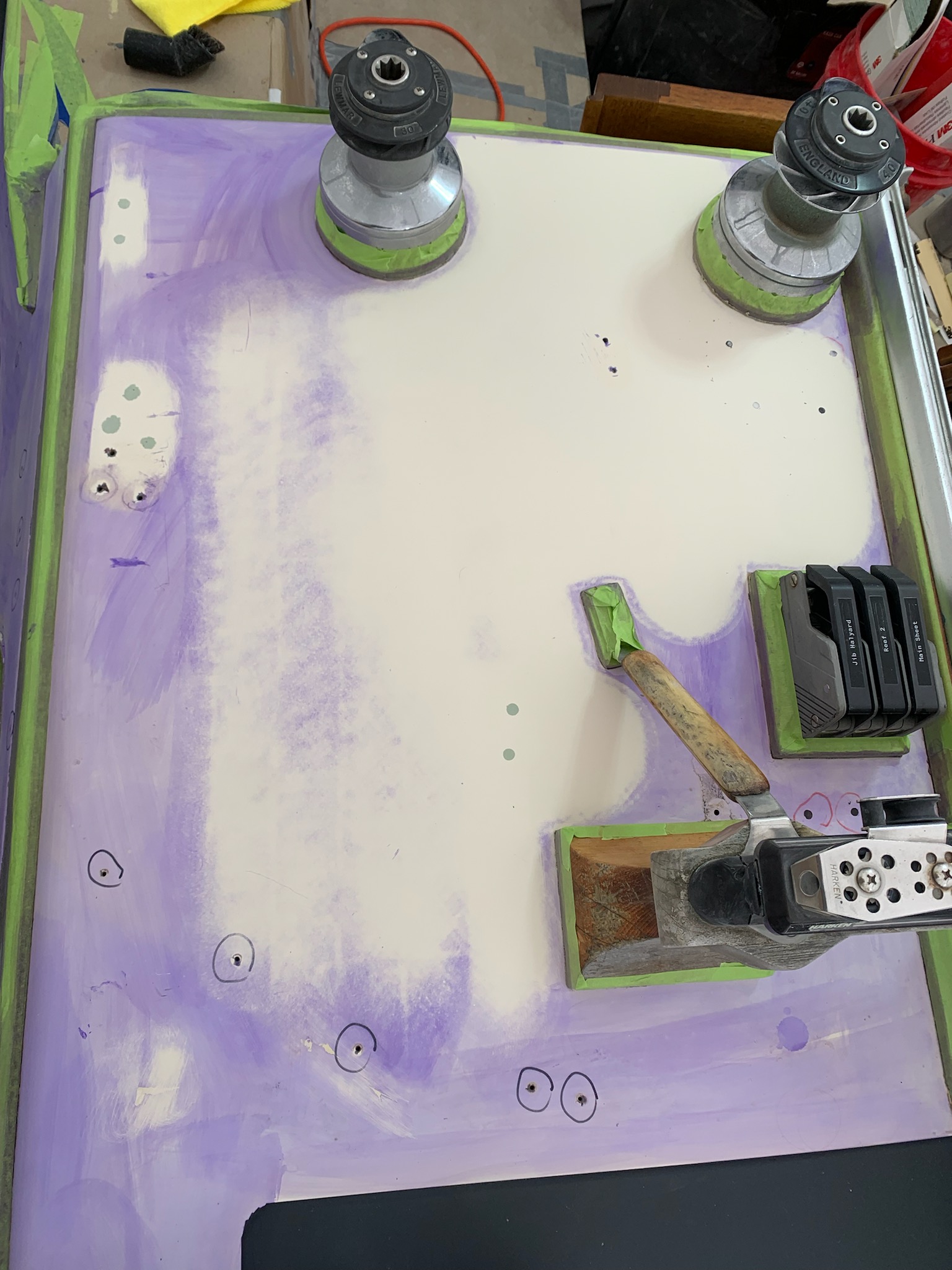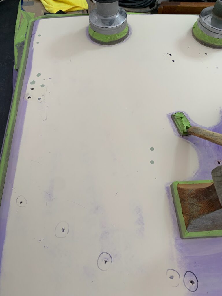 The guide coat on the cabin top is purple. Again we have some existing holes we need to keep for snaps for the dodger, but also some old ones where we changed to bigger winches and those need to be cleaned up here because they aren’t covered.