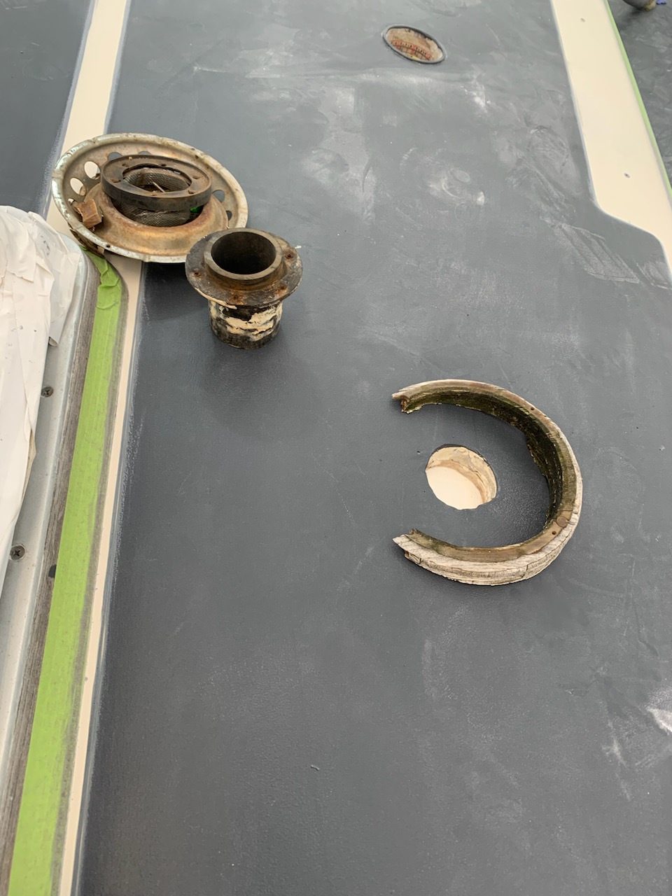 The sanded off guide coat tells us it’s ready to spray. Next up, gel coat, polish and non skid. Then we can start the hard work of reassembly.
